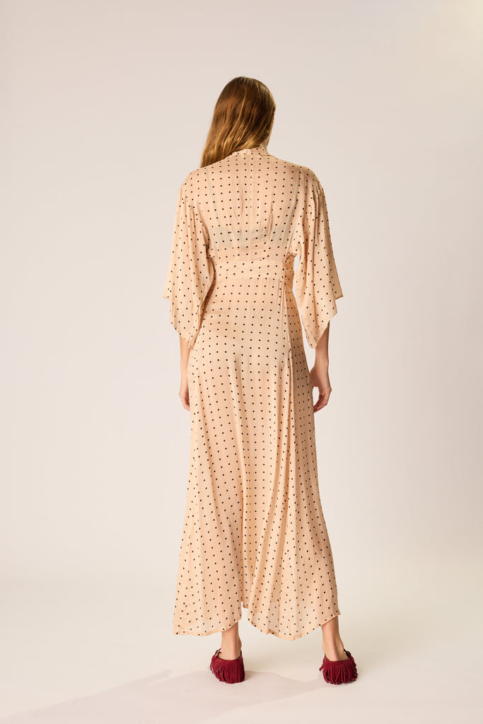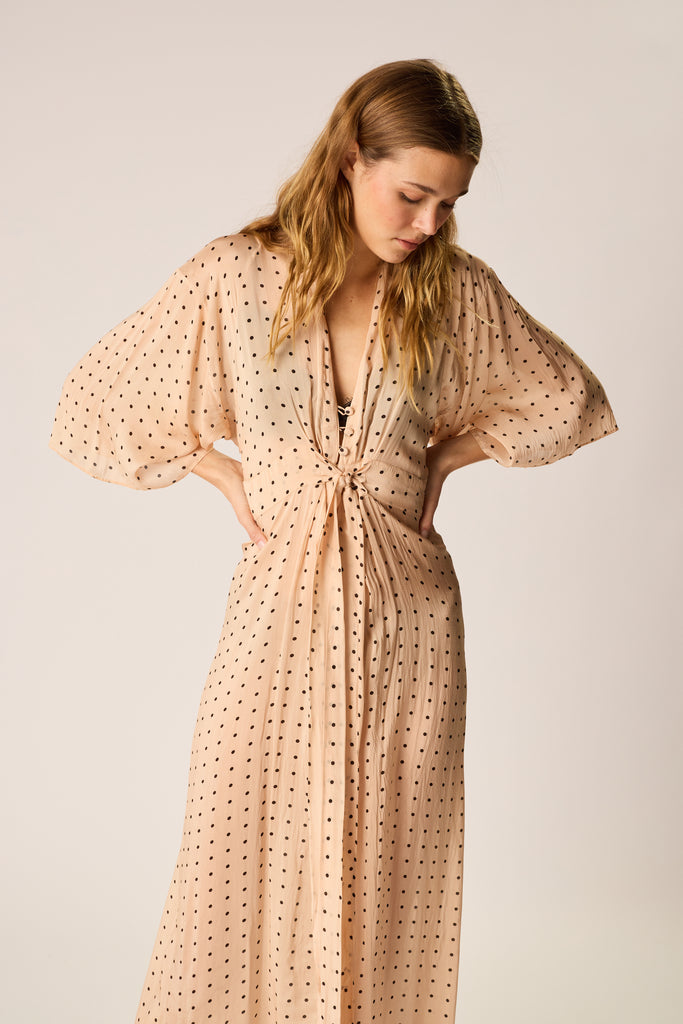 Crafted of viscose, this kimono style-dress features a plunging V-neck, billowing elbow length sleeves, and a concealed front-zip closure. Knot or wrap the long viscose ties for an ultra-feminine gathered silhouette.