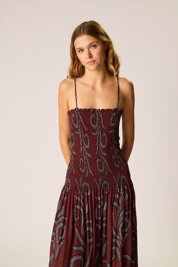 Maxi dress with an smocked bodice down to the hips, flounce hem, and tie-adjustable straps.