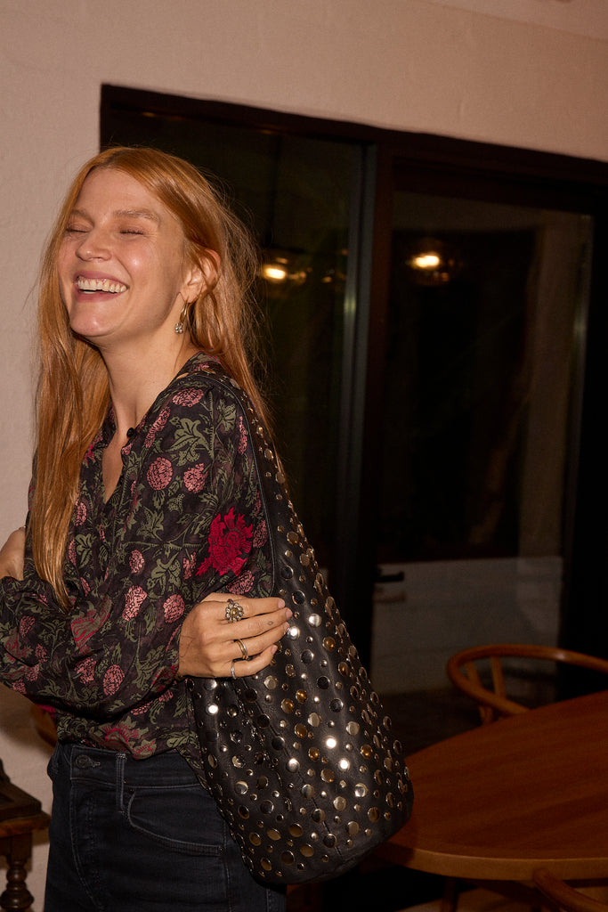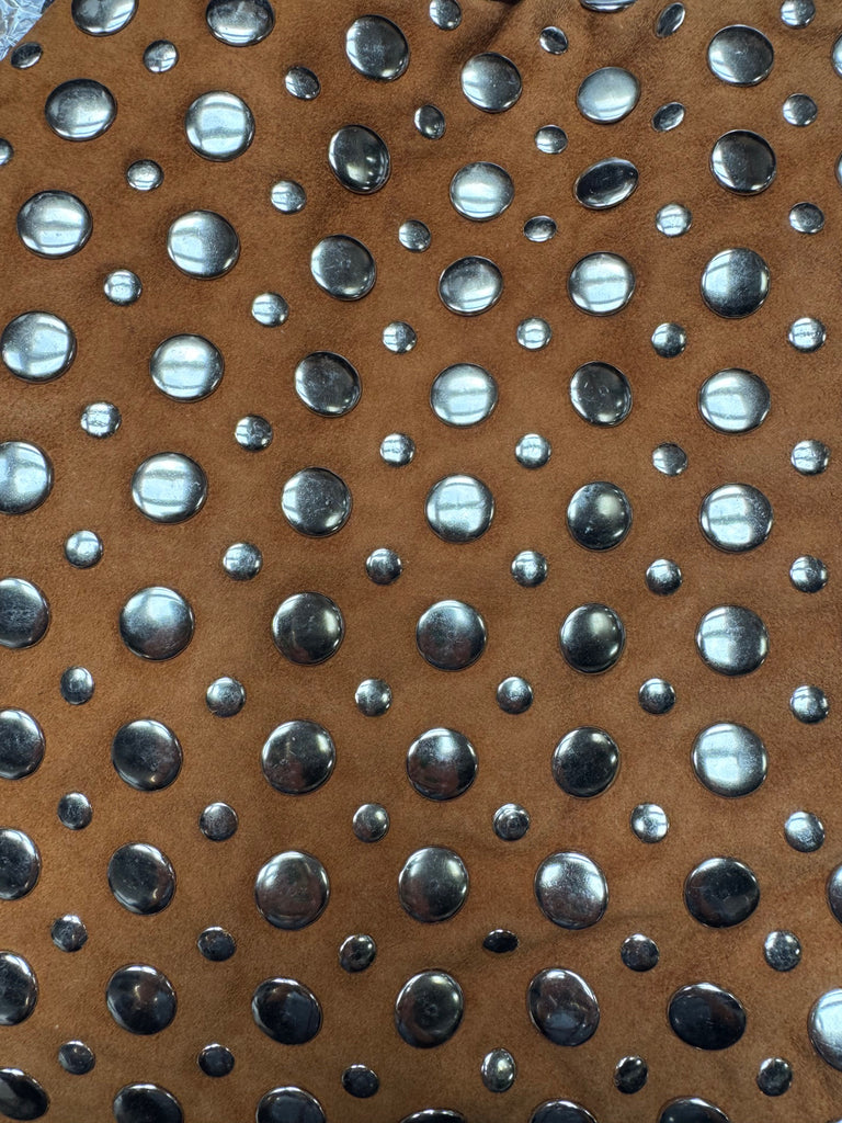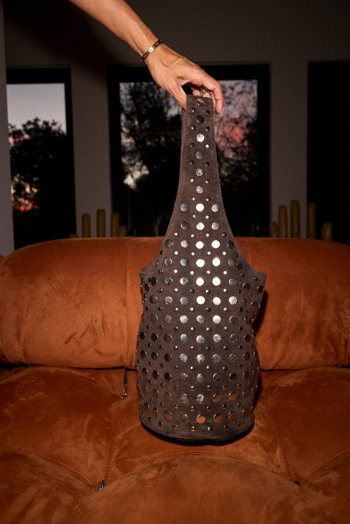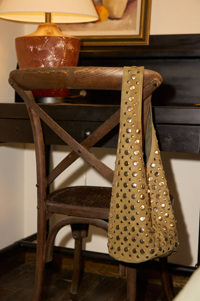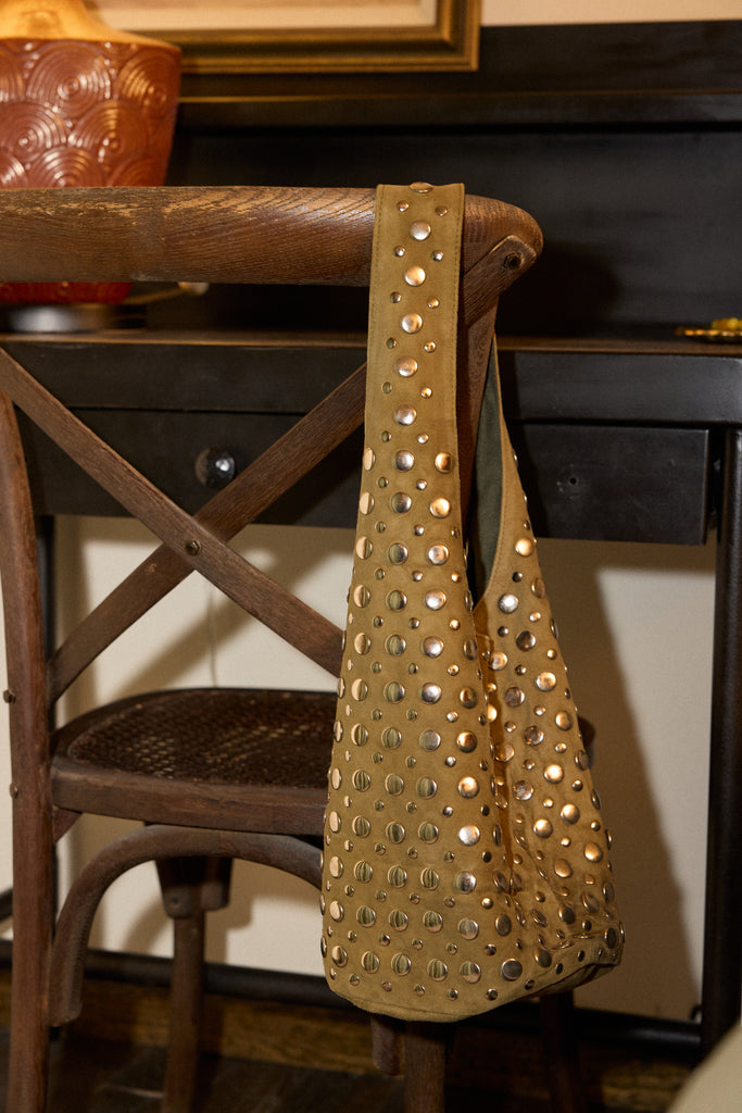 Handcrafted from cow leather, this handbag features thick straps and metal studs.