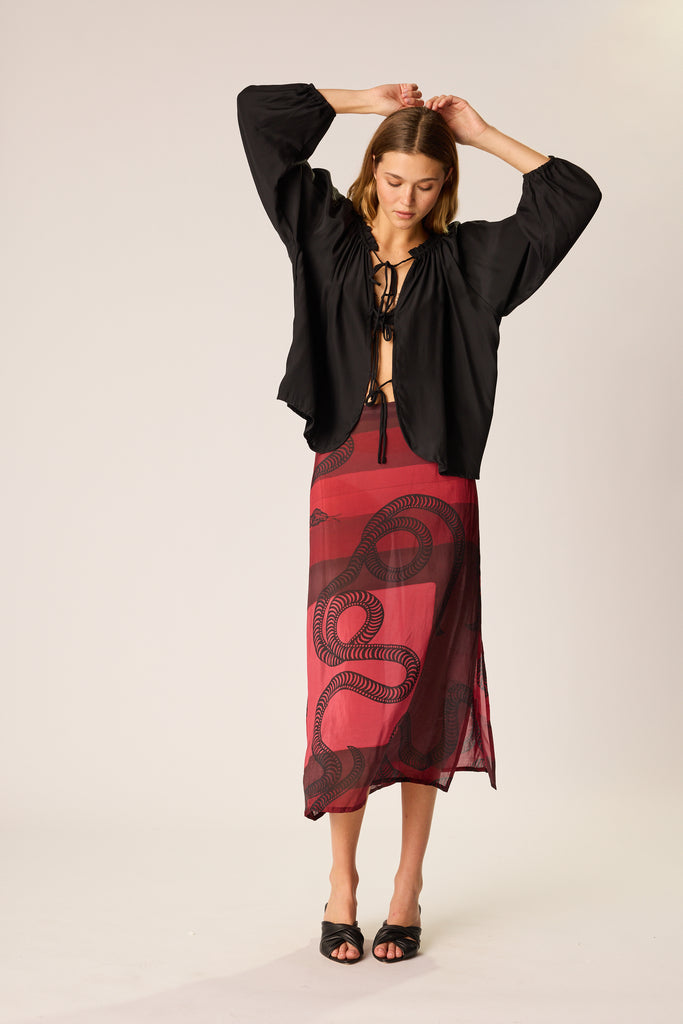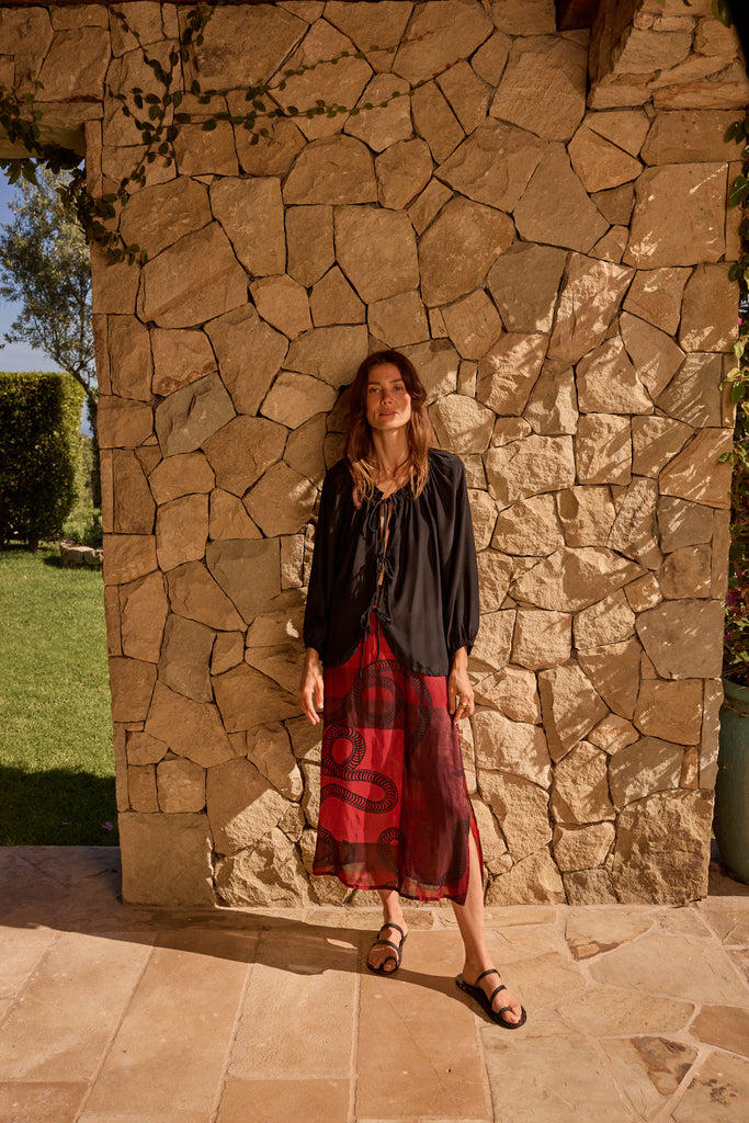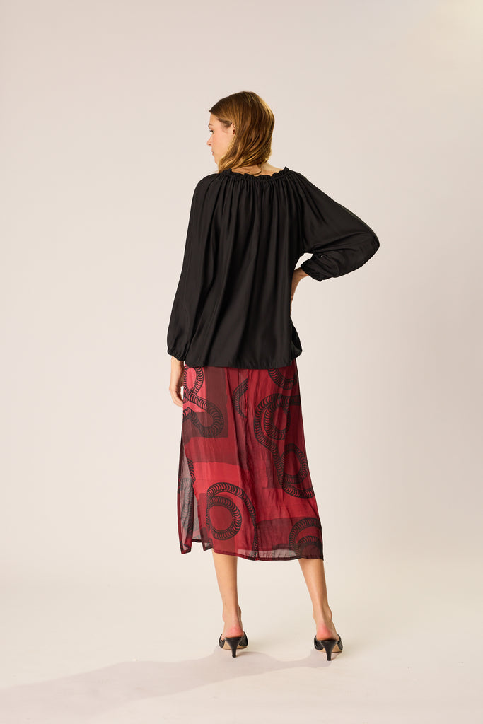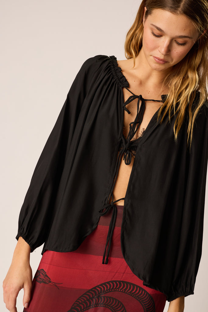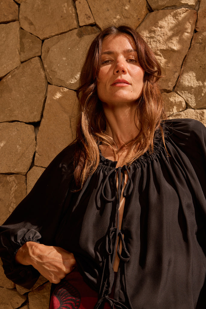 Our new Elise top has long sleeves and three ties down the front, adding a unique touch to its design. It can be worn as a chic top or layered as a jacket for extra warmth and style. Versatile and functional, the Elise is a great addition to any wardrobe for both casual and more dressed-up occasions.