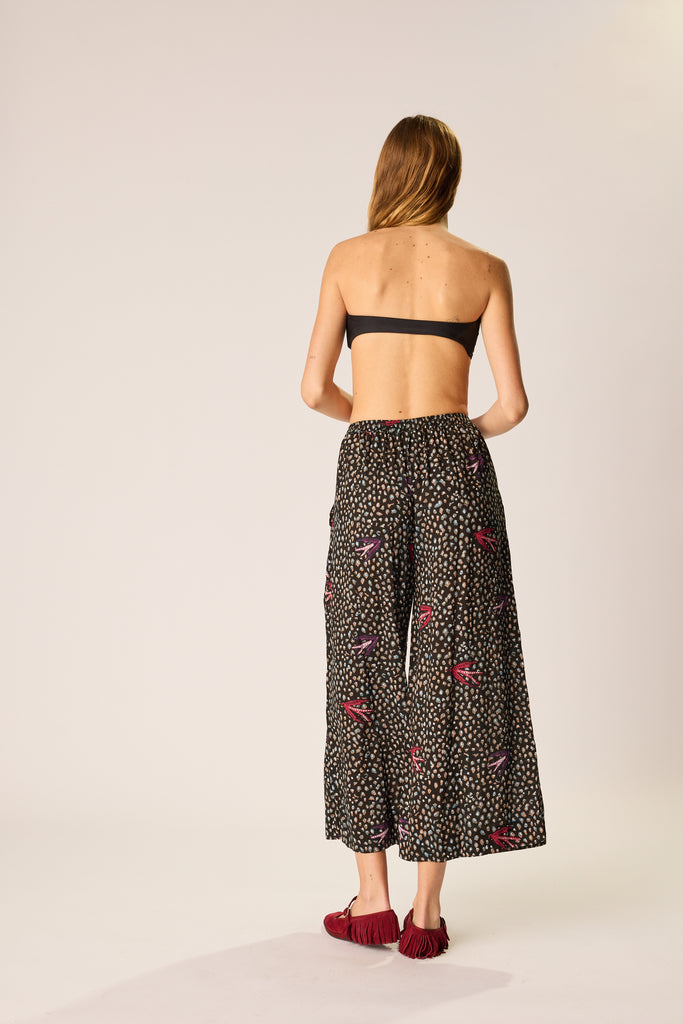 Cased elastic waist with tasseled tie, pockets, and loose wide legs.