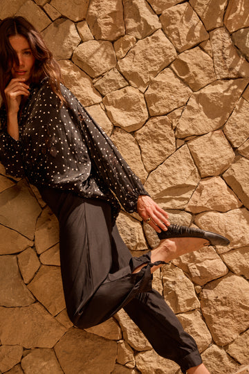 The Margherita pant has a flat front and elastic back for flattering comfort. Ties at the ankle bring in the pant to give it a slight harem feel but not overwhelming.