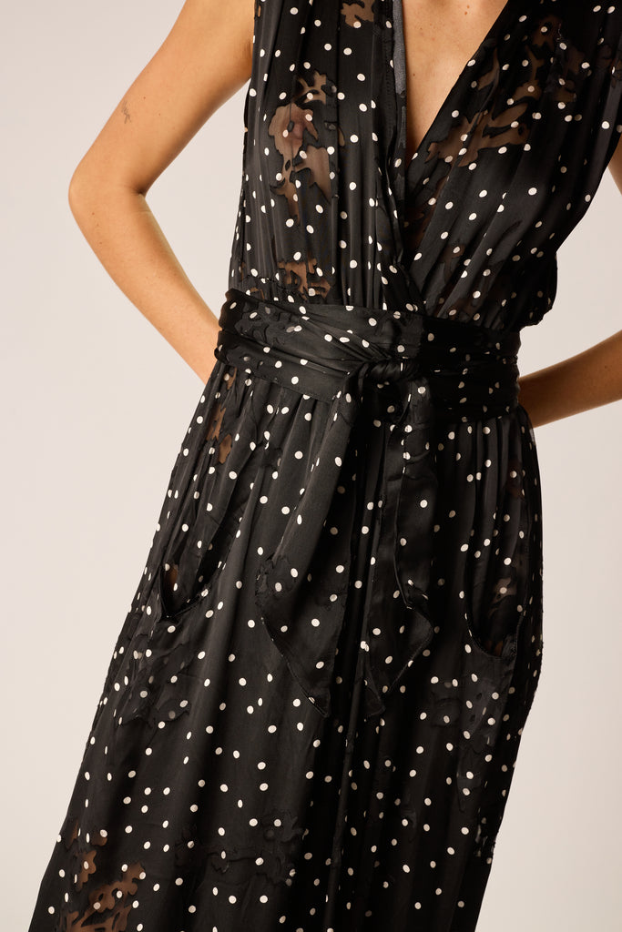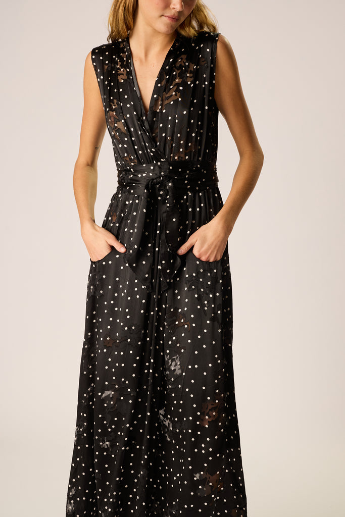 Sleeveless maxi dress with double snap closure across elastic waist.