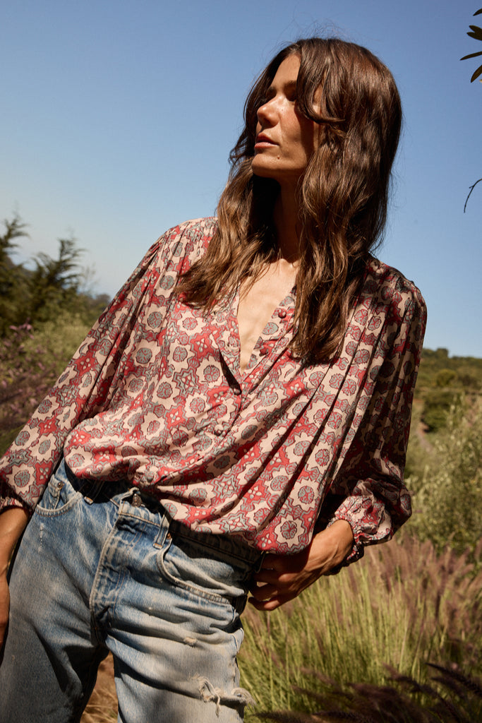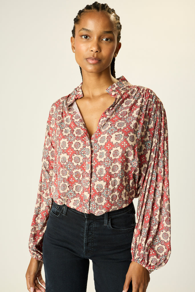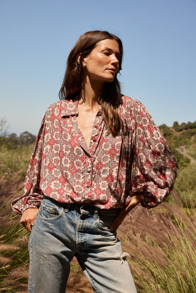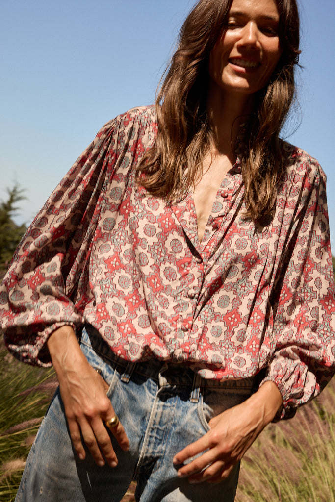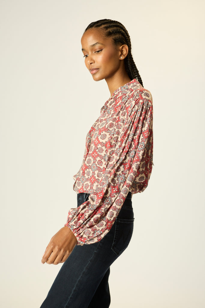 Featuring peasant sleeves with elastic cuffs.