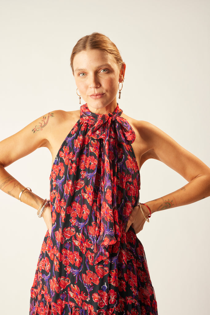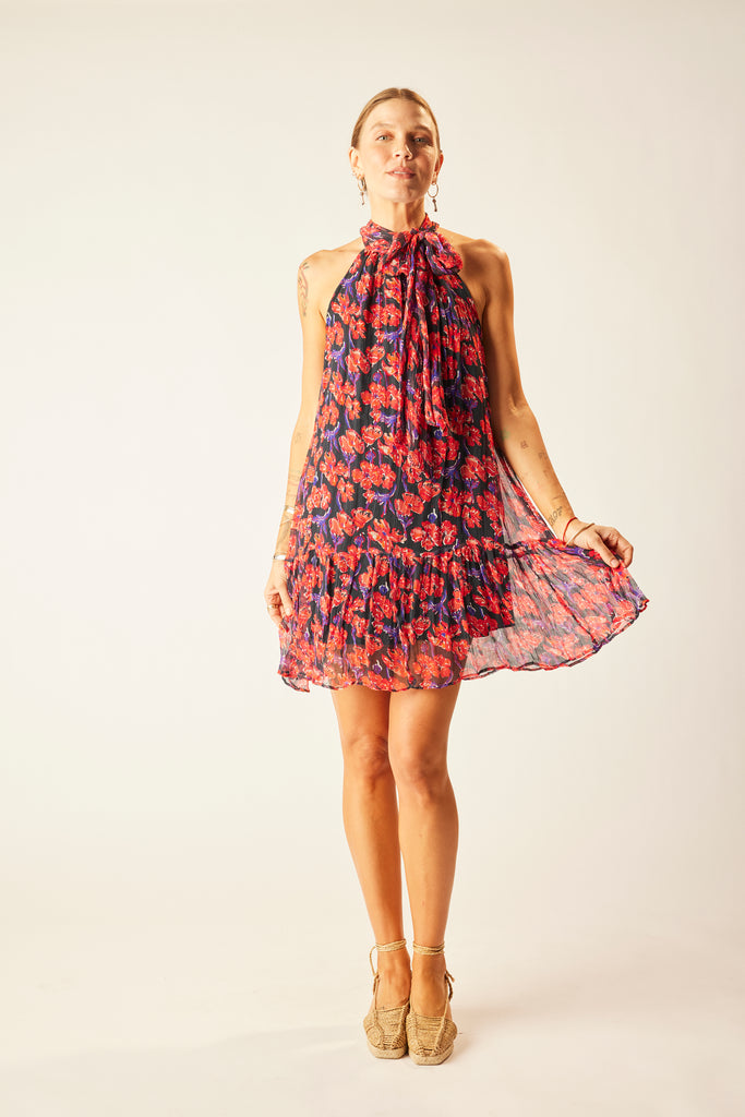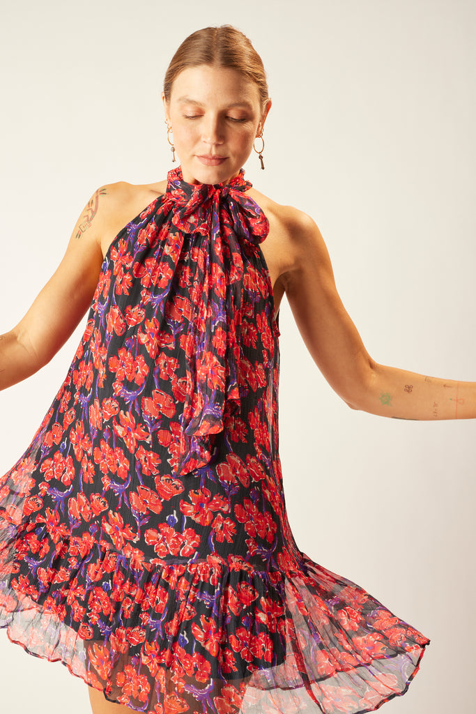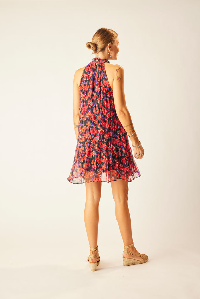 Mini length dress with buttoned halter neck.