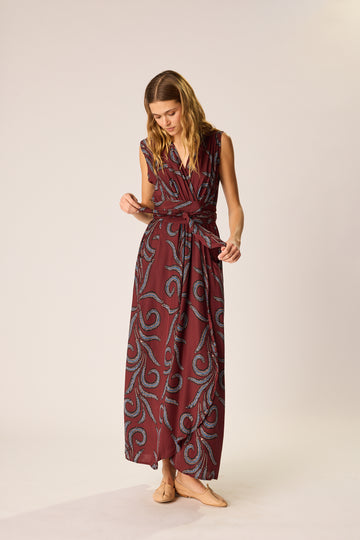 Sleeveless maxi dress with double snap closure across elastic waist.