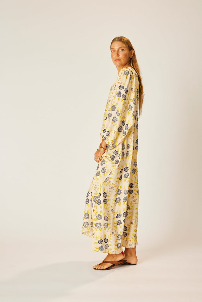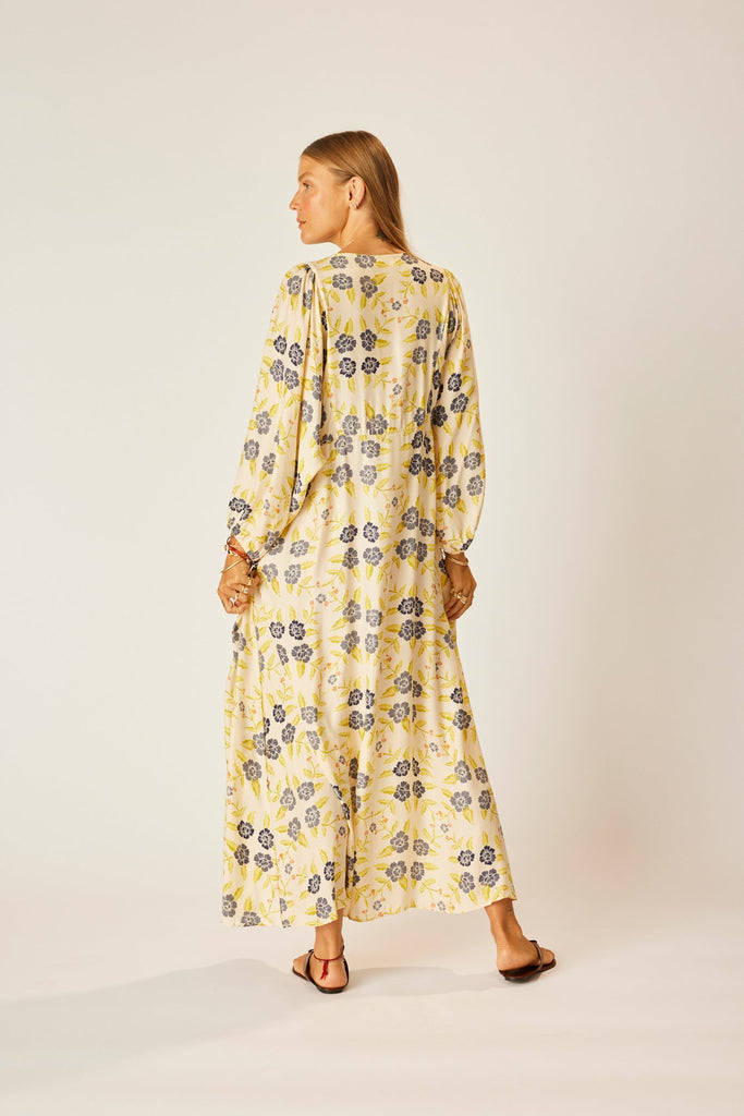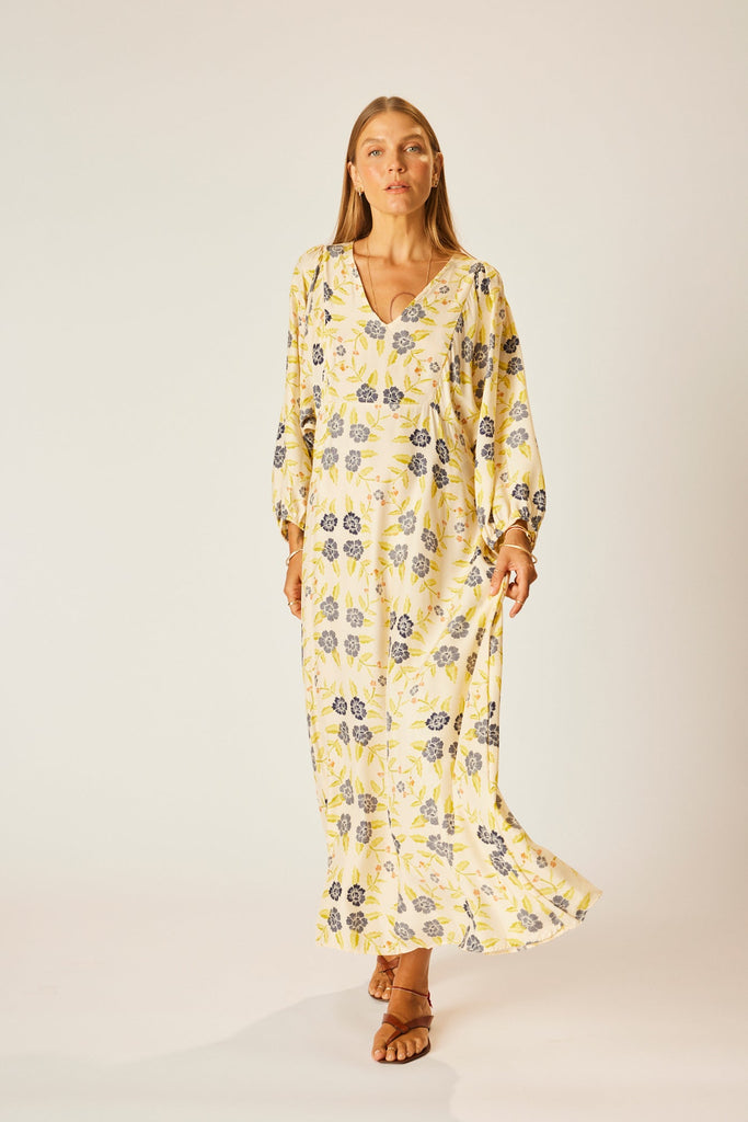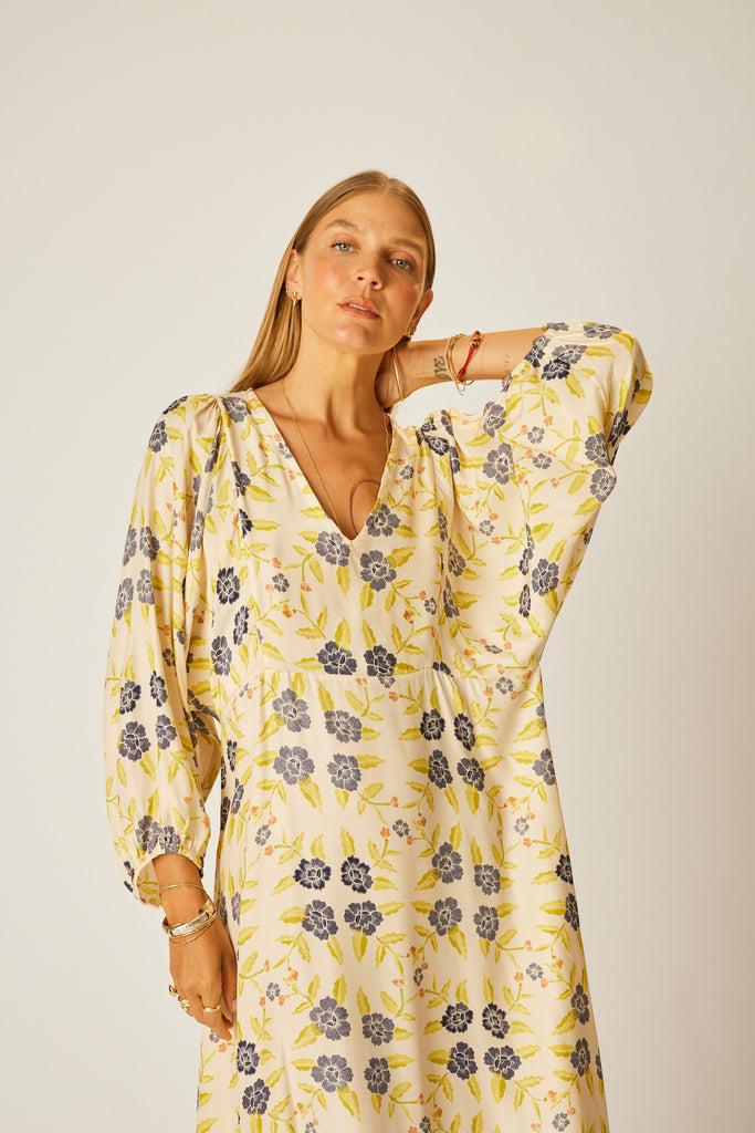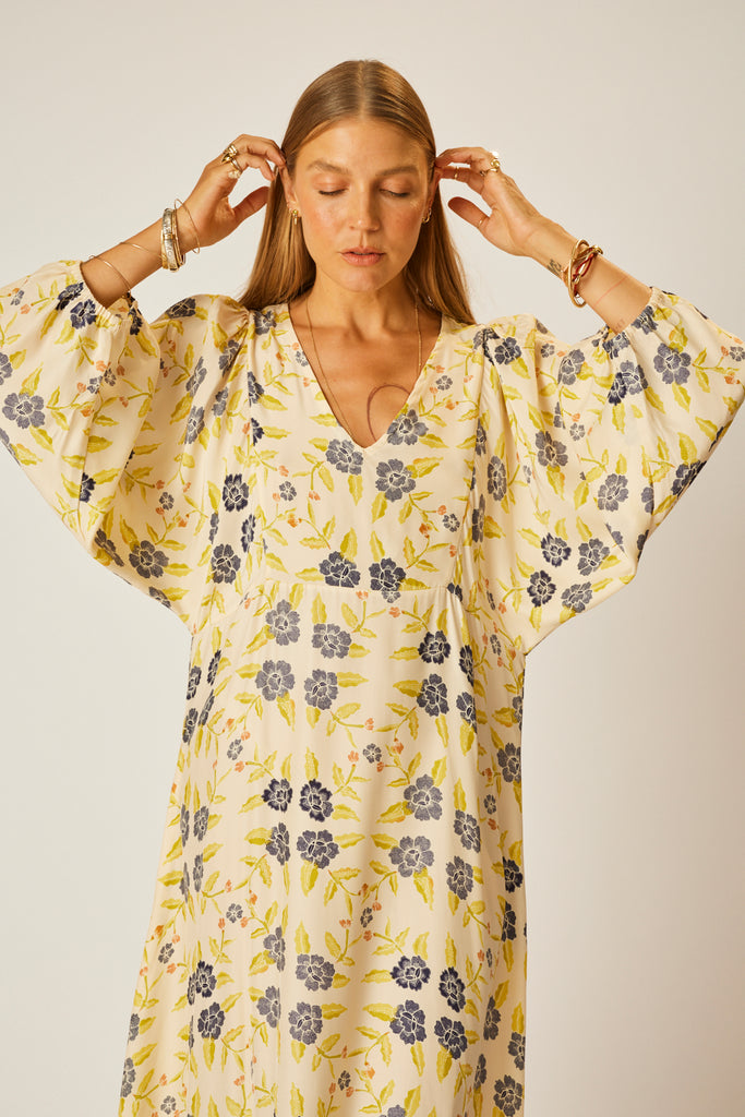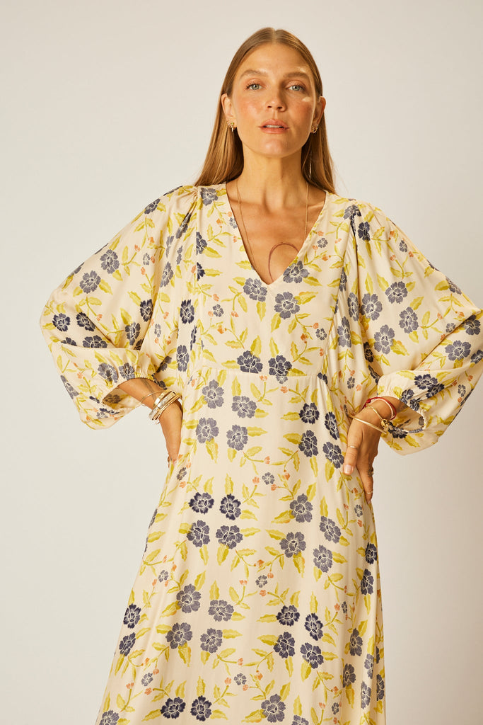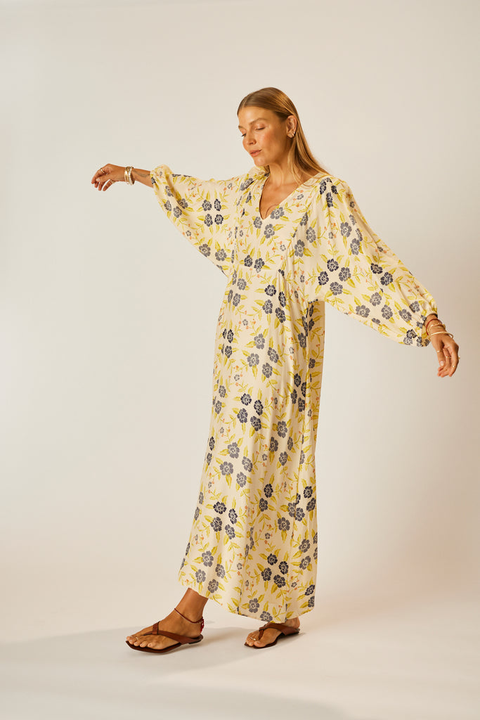 Flowy maxi dress with V-neckline and voluminous long sleeves.