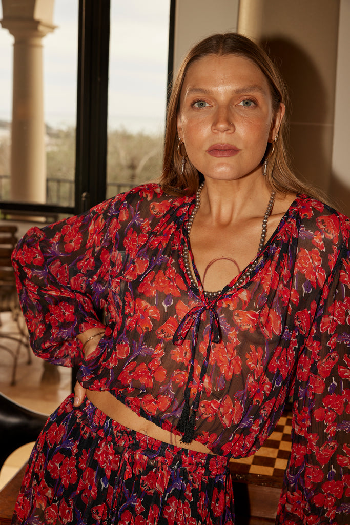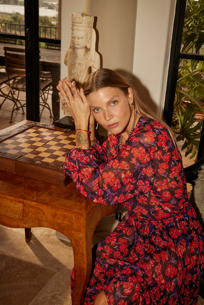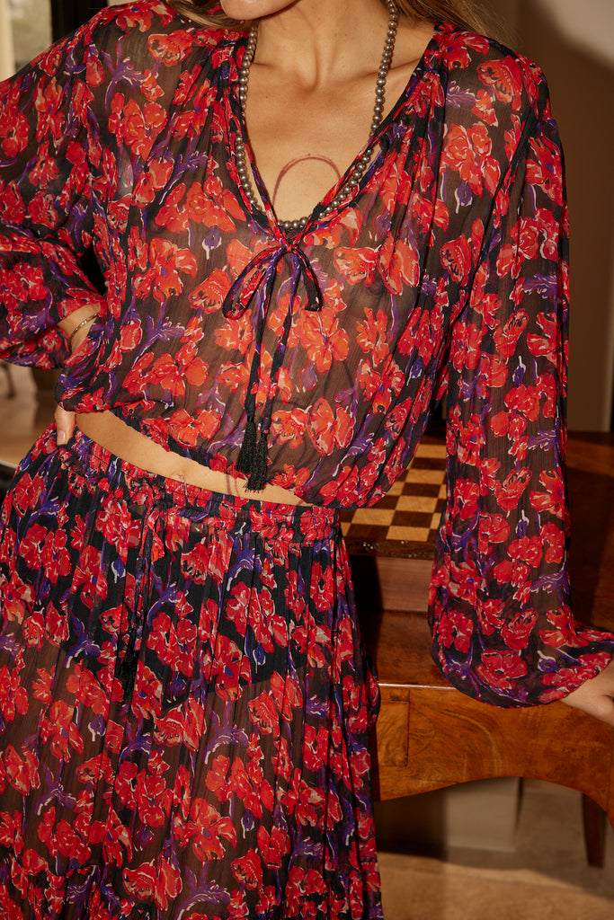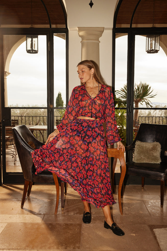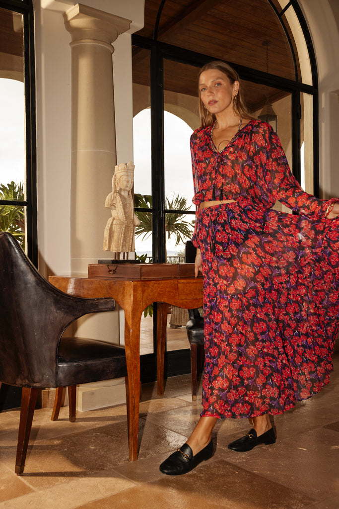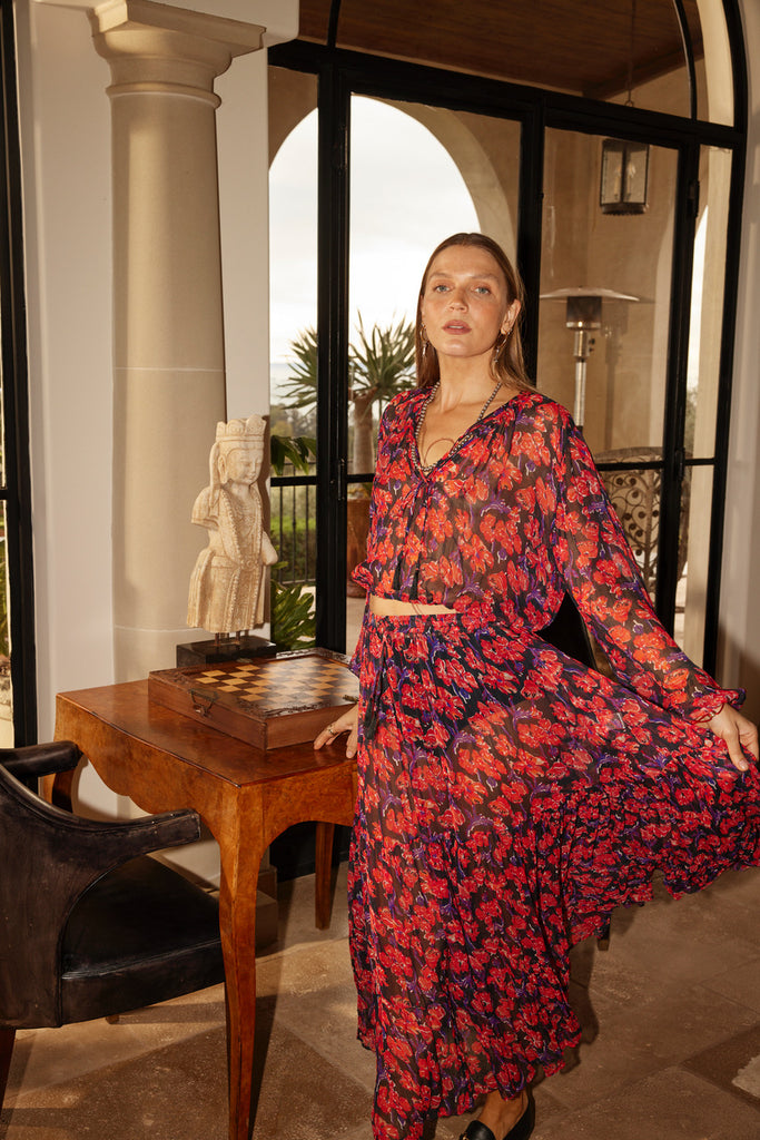 Styled with the Sierra Skirt in Chiffon Watercolor Print Onyx.