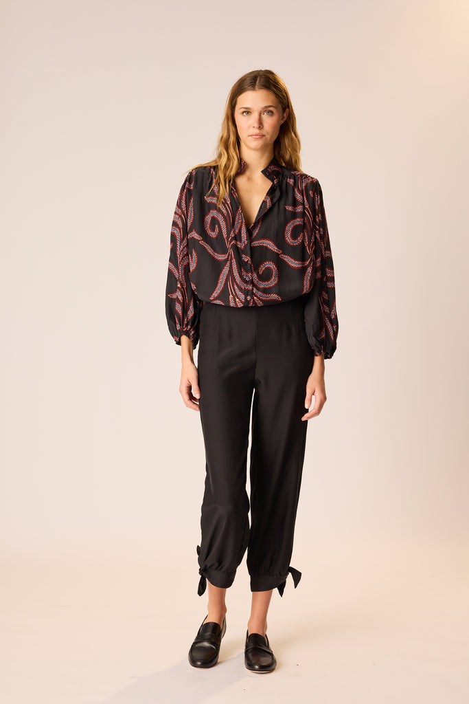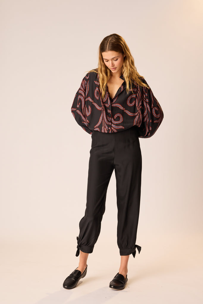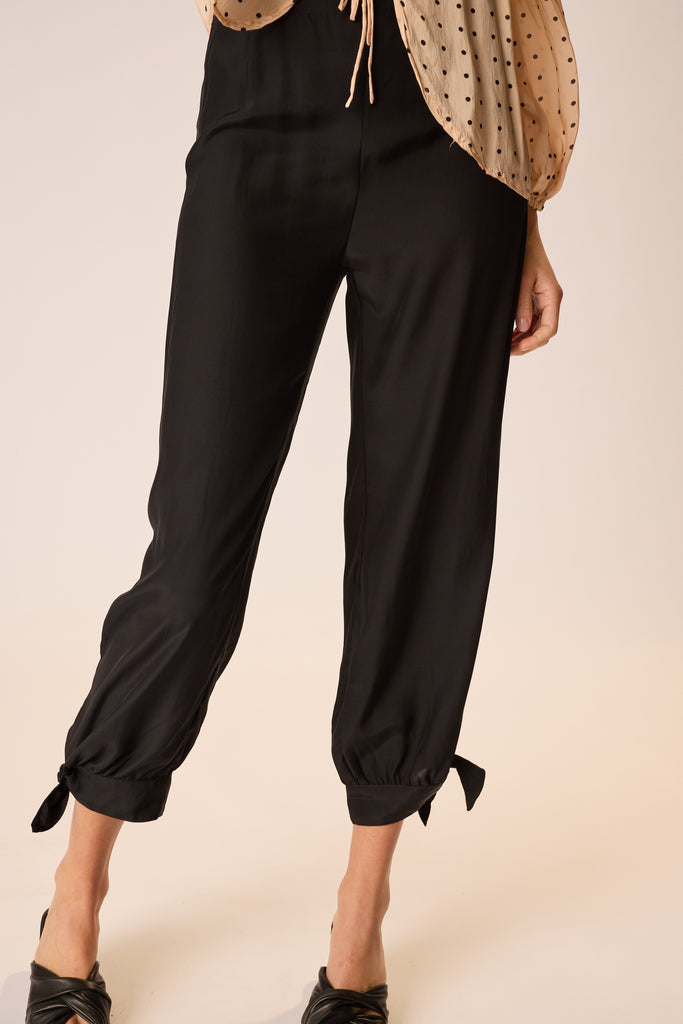 The Margherita pant has a flat front and elastic back for flattering comfort. Ties at the ankle bring in the pant to give it a slight harem feel but not overwhelming.