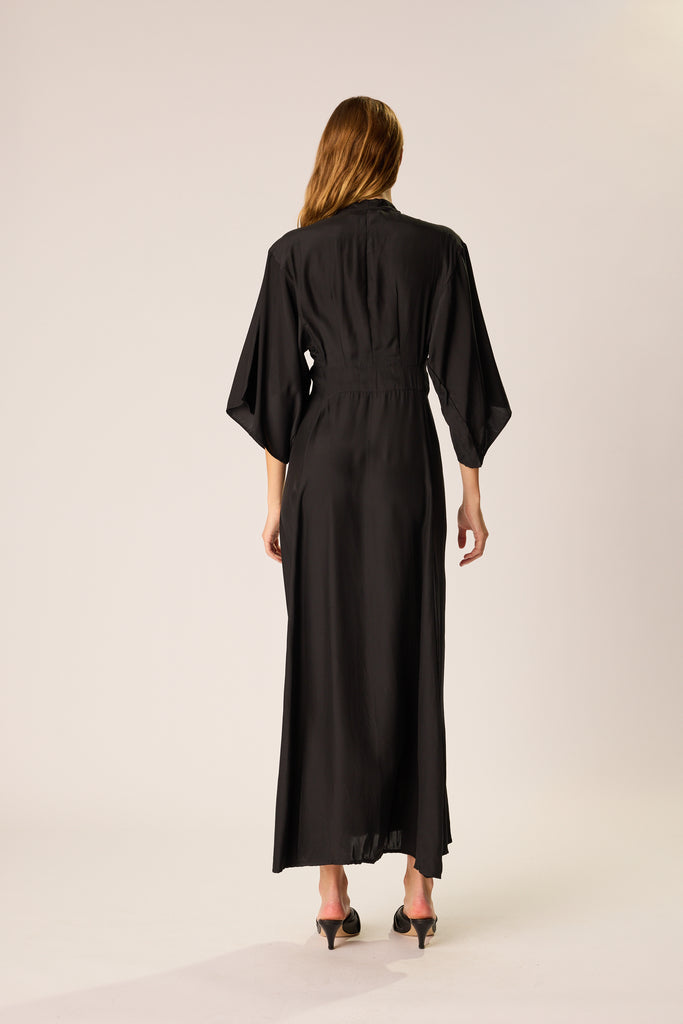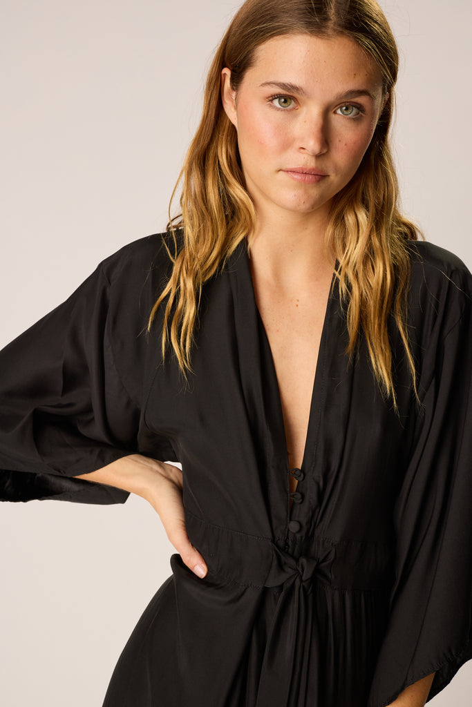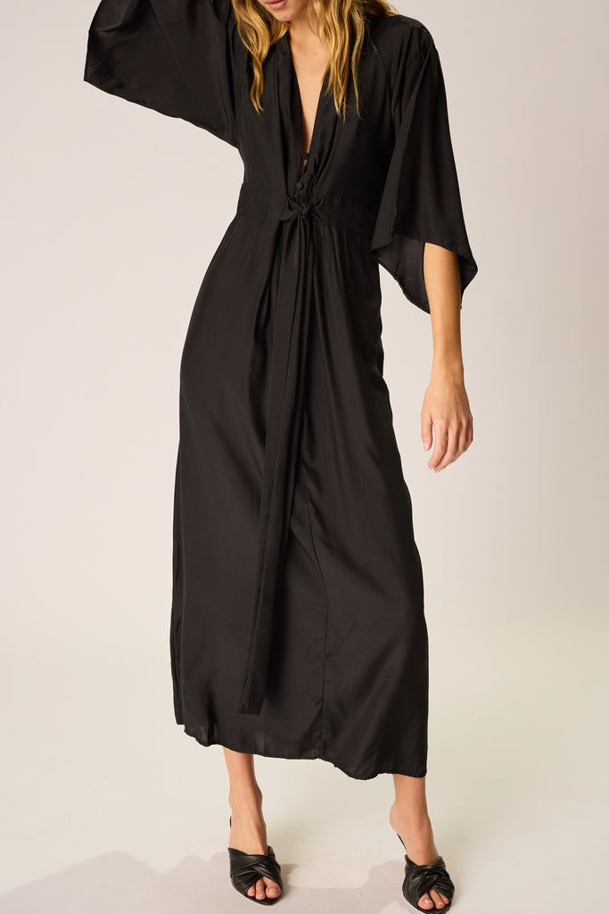 Crafted of silk, this kimono style-dress features a plunging V-neck, billowing elbow length sleeves, and a concealed front-zip closure. Knot or wrap the long silk ties for an ultra-feminine gathered silhouette.