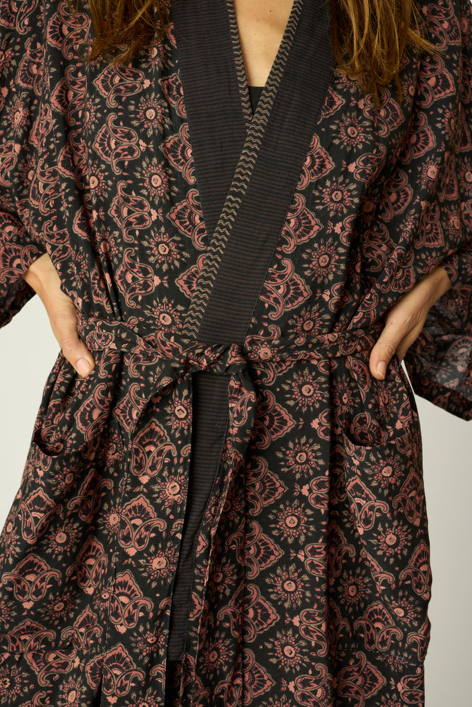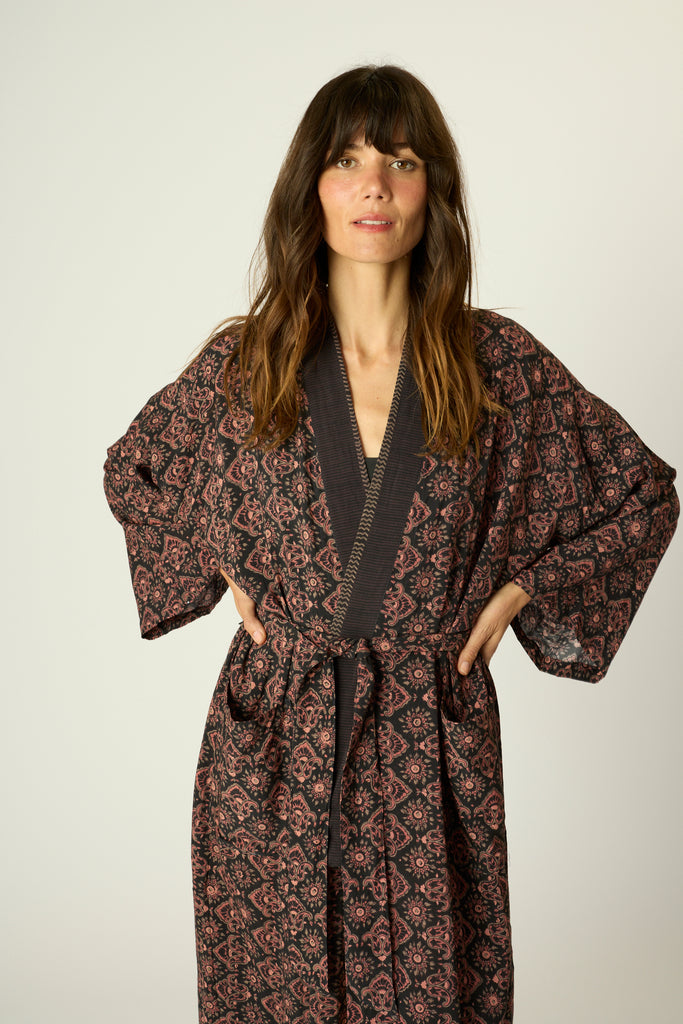 Japanese inspired robe with a drop shoulder and full sleeves.