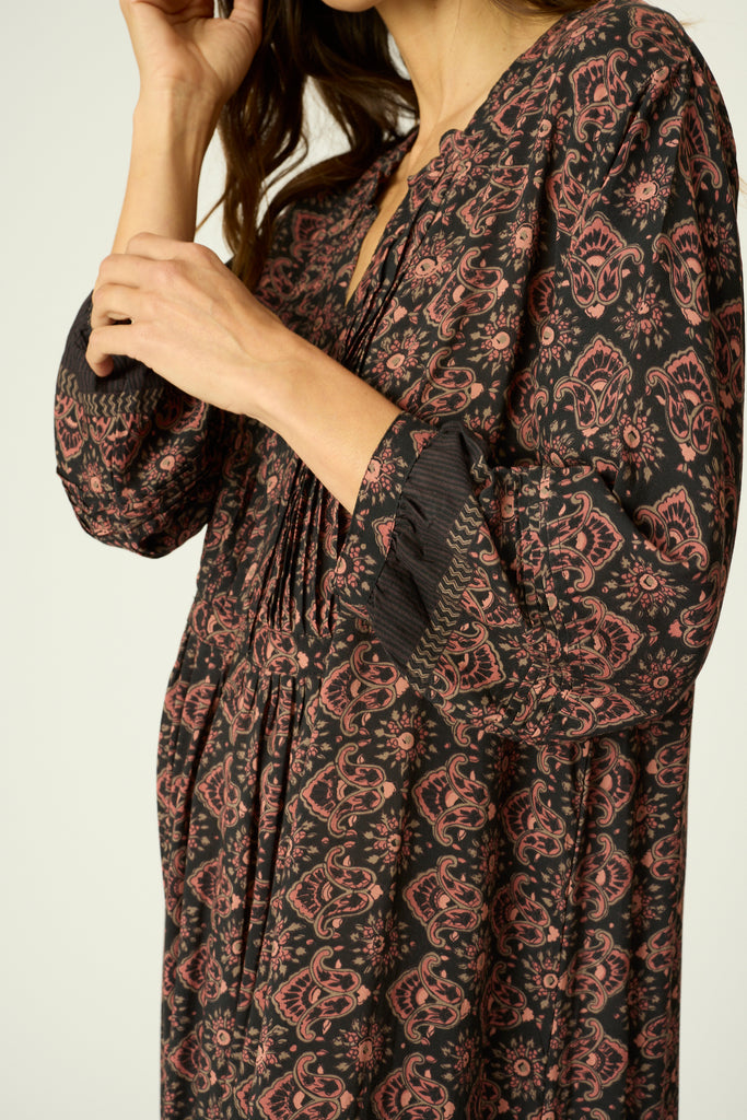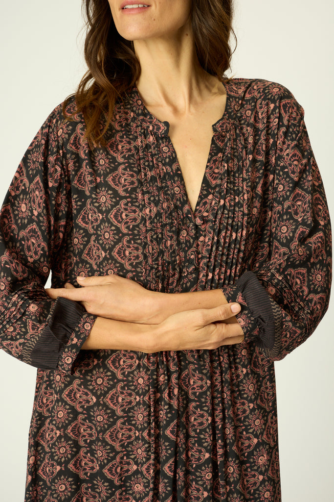 Short dress with v-neckline and pleated bib.