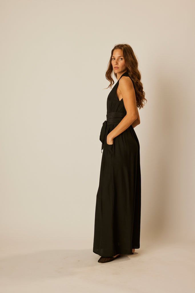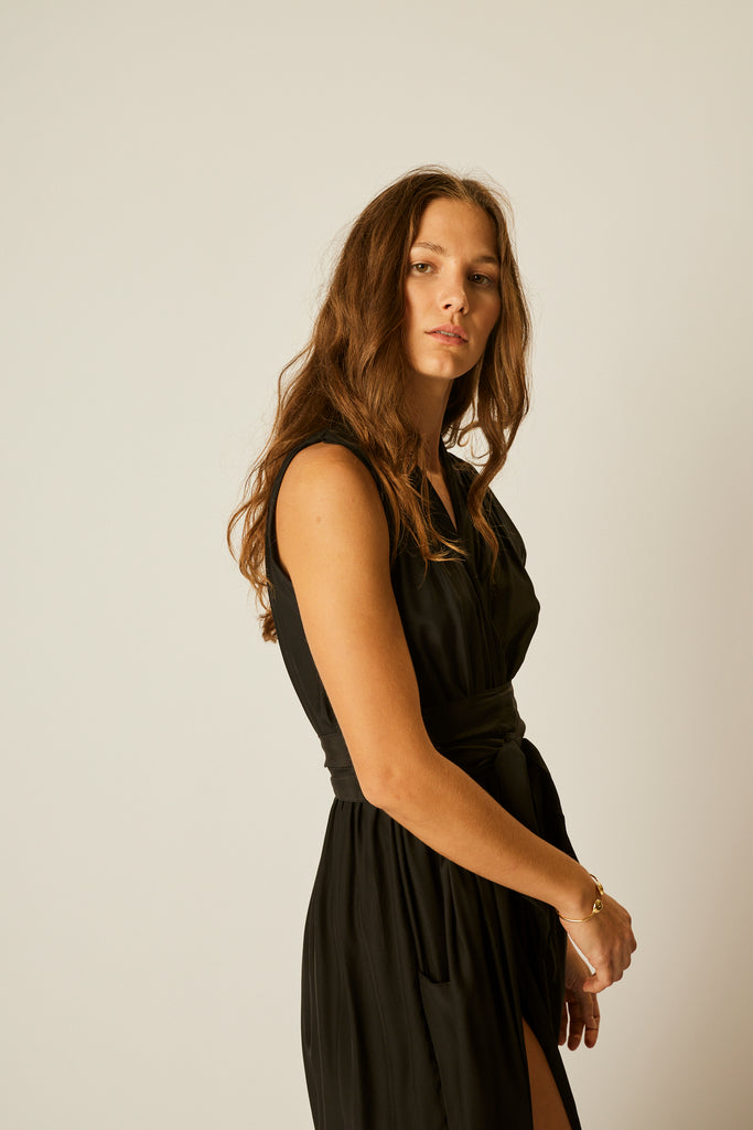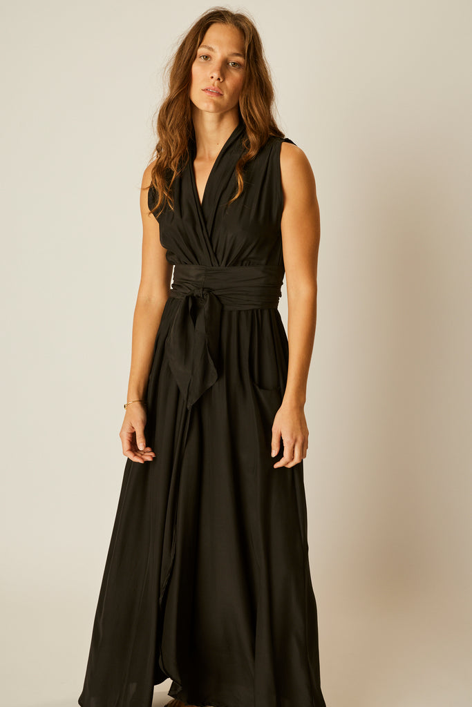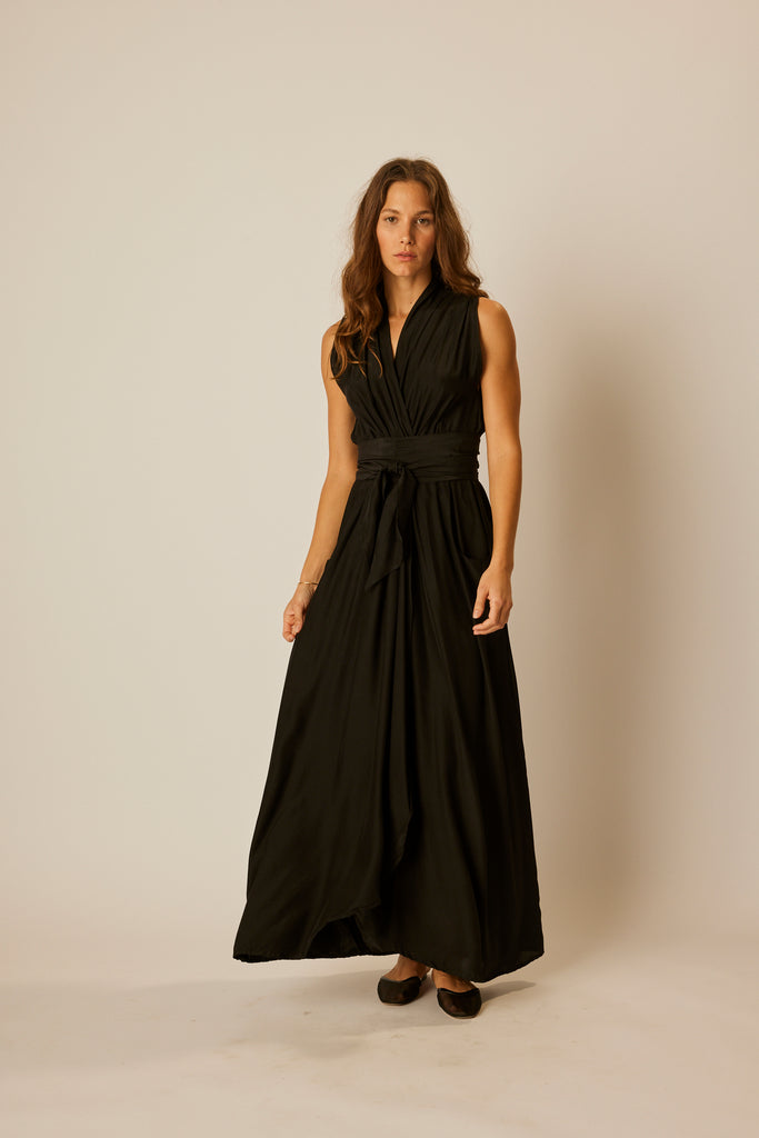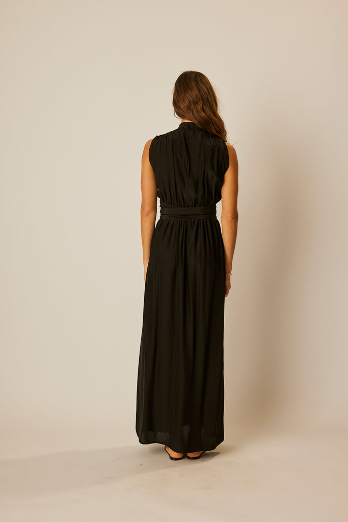 Sleeveless maxi dress with double snap closure across elastic waist.