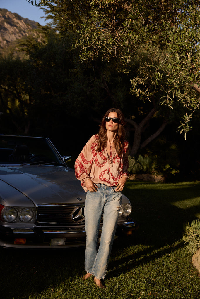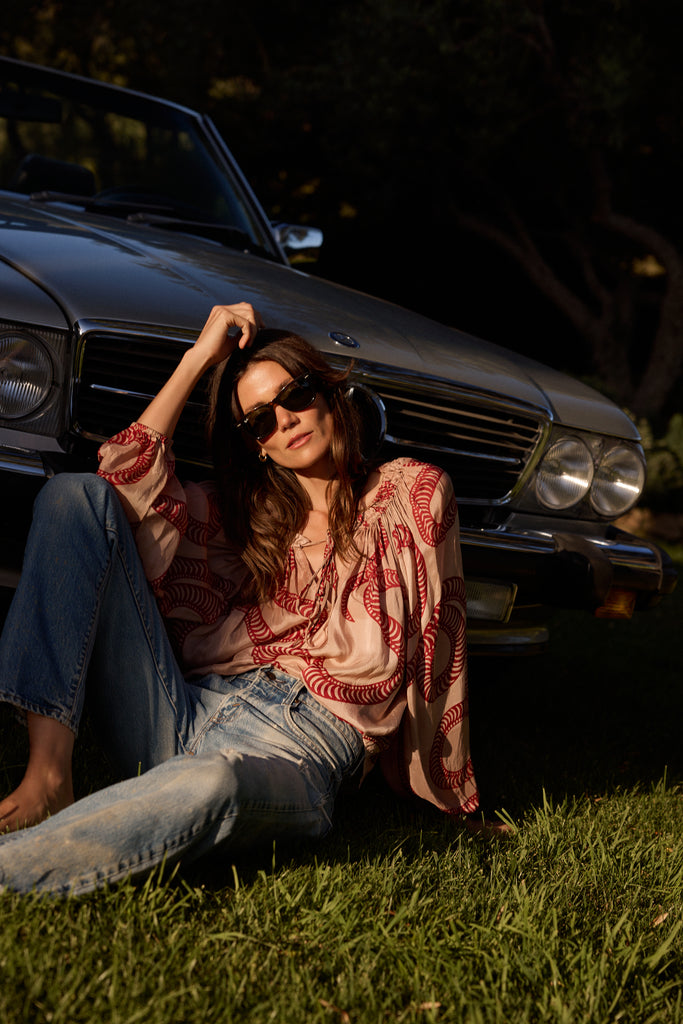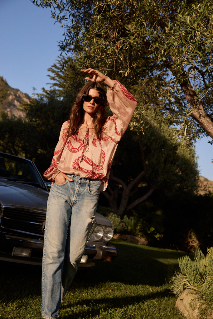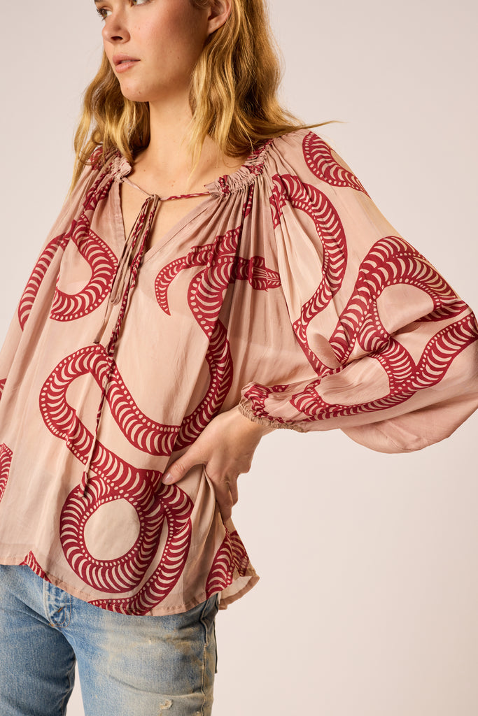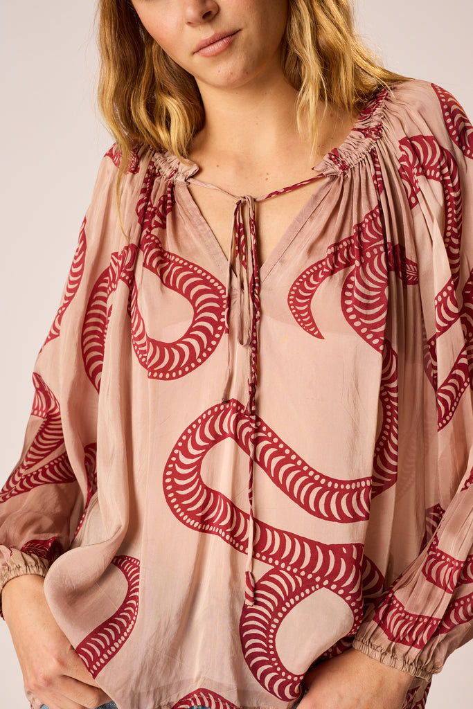 Cut in a fluid, oversized silhouette with feminine tie-detailing at the neck and elasticized sleeves making Ashley an easy to pair wardrobing staple.