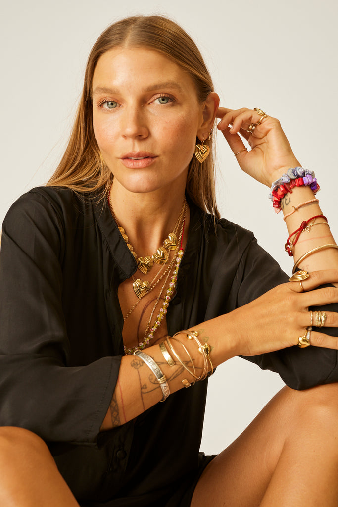 Small double heart bracelet open bracelet, one size fits most. A statement piece that can be worn every day. Sterling Silver base in 14k yellow gold vermeil.