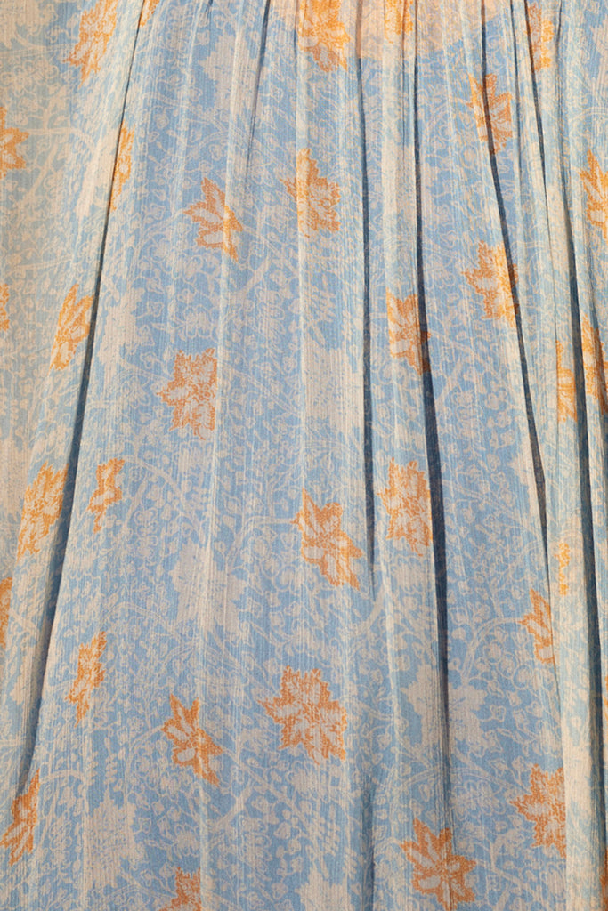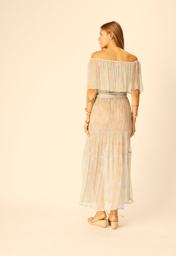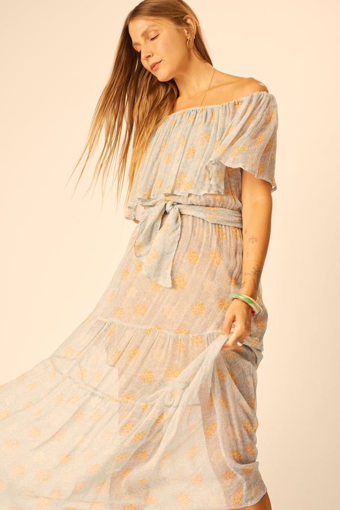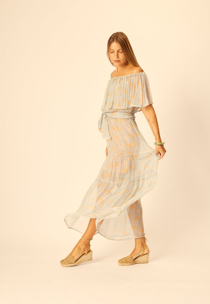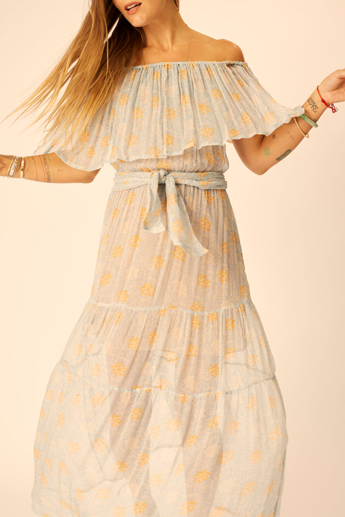 Tiered maxi dress with scoop neckline with ruffled collar.