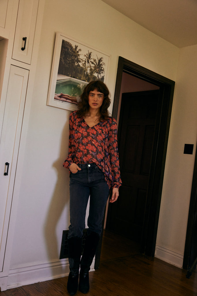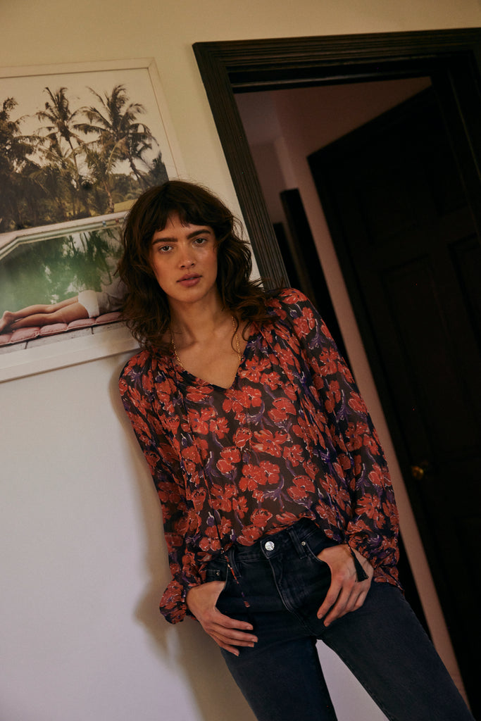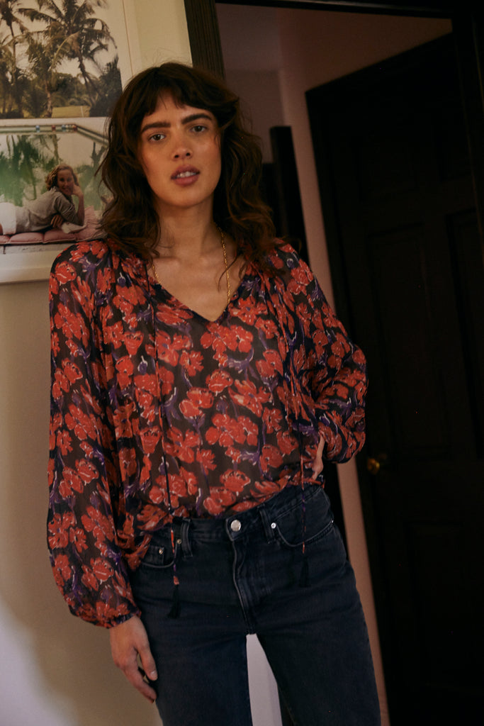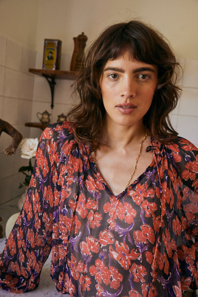 Flowy blouse with voluminous sleeves and button closure at wrist.