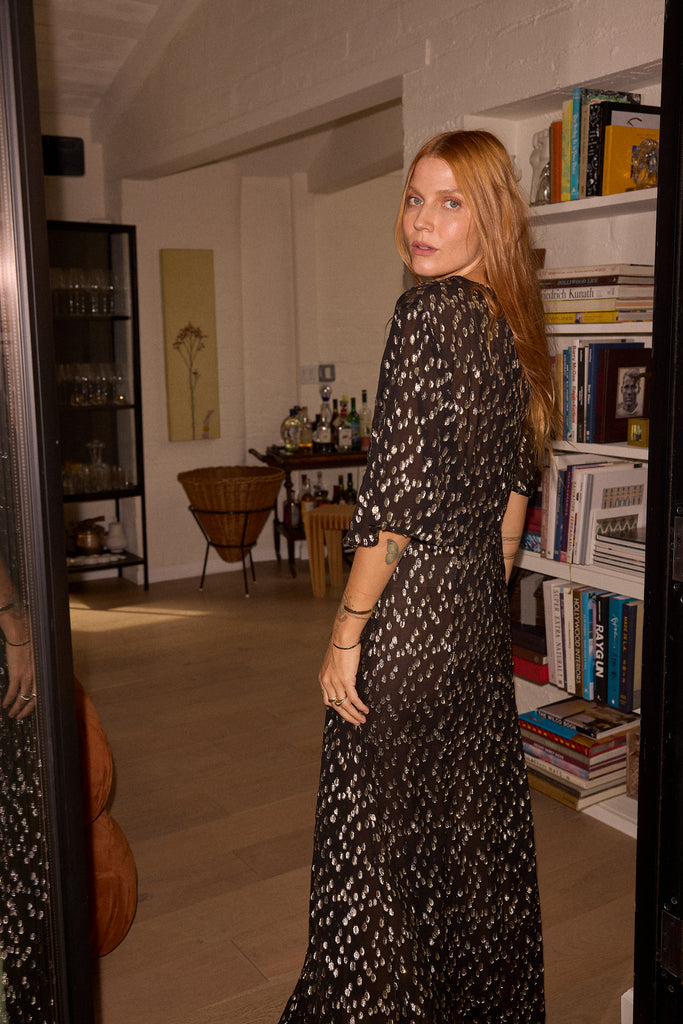Maxi dress with darted bodice and petal-like flutter sleeves.