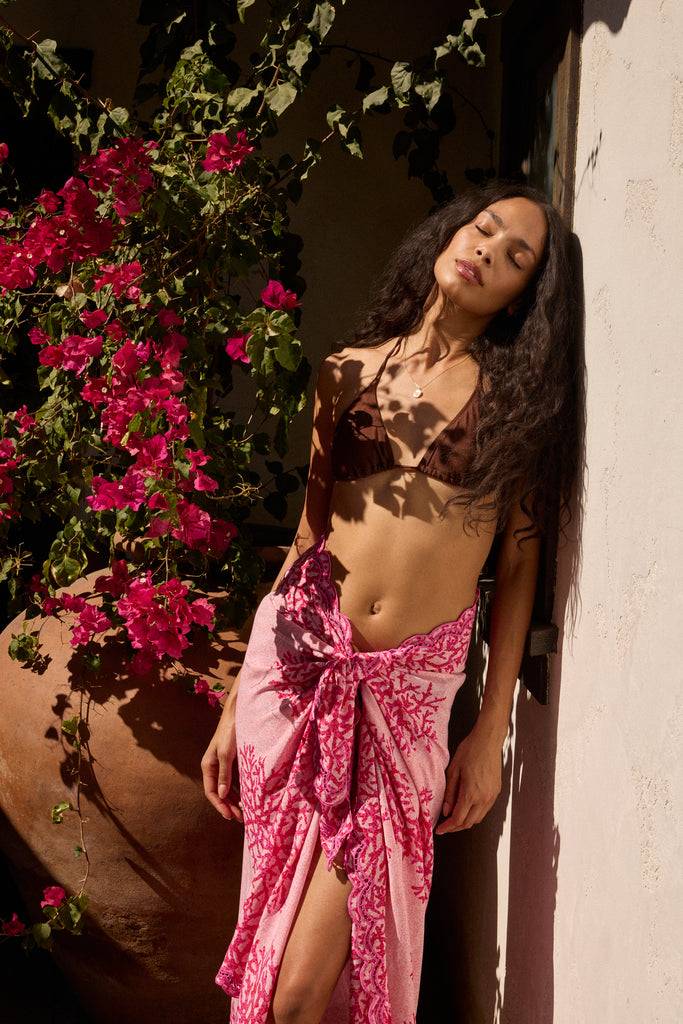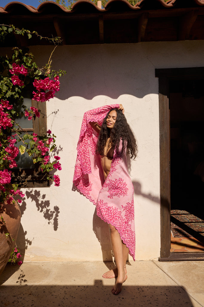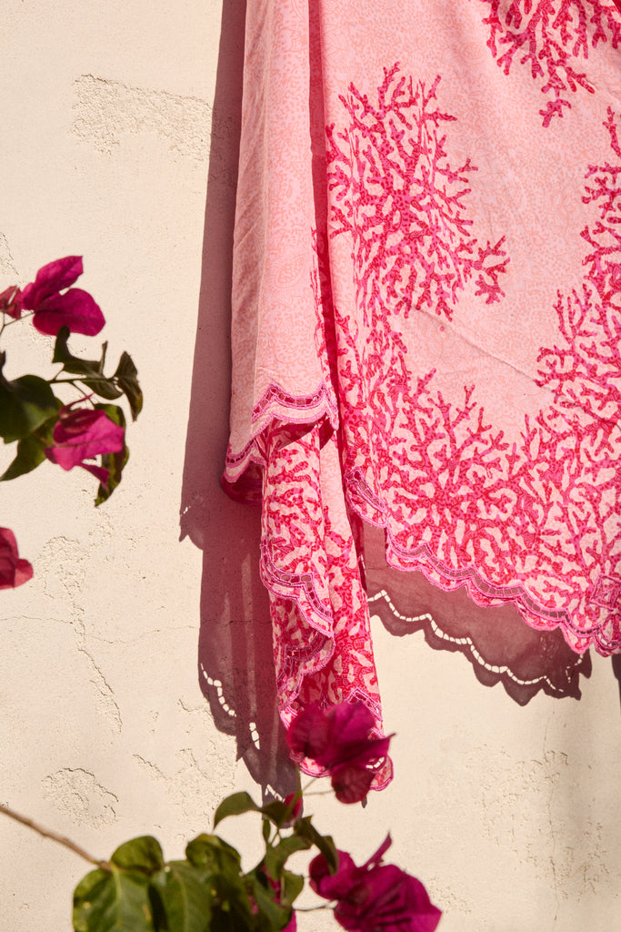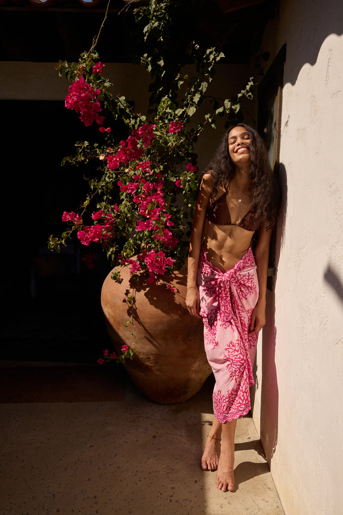Our NM Heritage Embroidered Sarong brings artistry to the everyday, blending function with heirloom beauty. Reverse-dyed and hand-stamped with intricate coral motifs—each print subtly unique. Finished with delicate embroidery along the hem, it’s an effortless piece meant to be worn, wrapped, and treasured season after season.