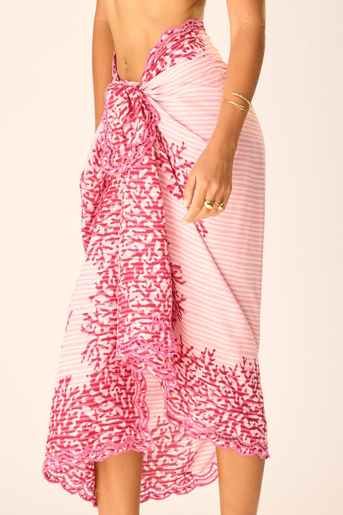 Our NM Heritage Embroidered Sarong brings artistry to the everyday, blending function with heirloom beauty. Reverse-dyed and hand-stamped with intricate coral motifs—each print subtly unique. Finished with delicate embroidery along the hem, it’s an effortless piece meant to be worn, wrapped, and treasured season after season.