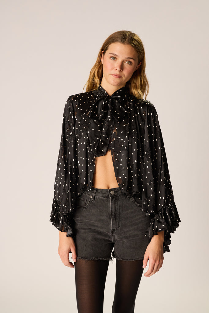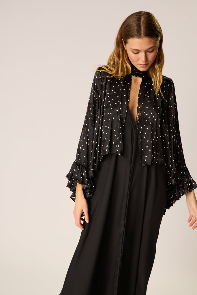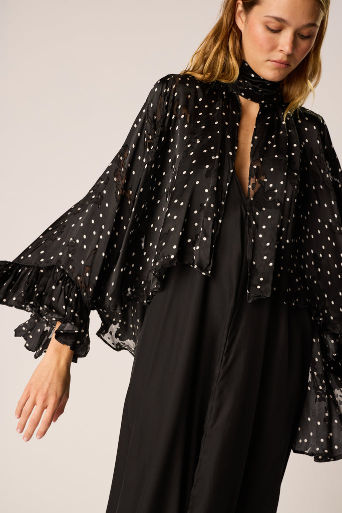 Our new cape takes you directly from the beach to your brunch. A tie-detail v neck paired with a fluid oversized silhouette donning feminine side slits and elegant seaming making it an easy to style wardrobe staple.