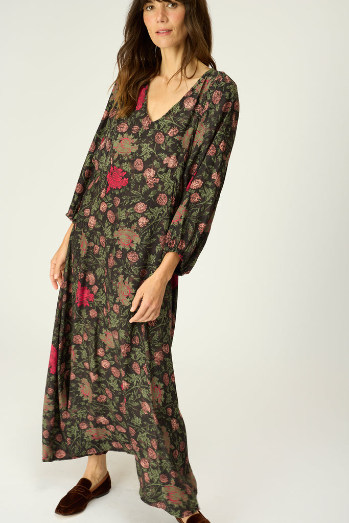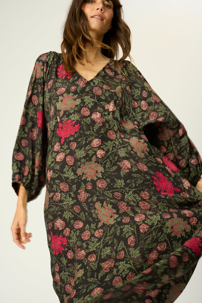 Flowy maxi dress with V-neckline and voluminous long sleeves.