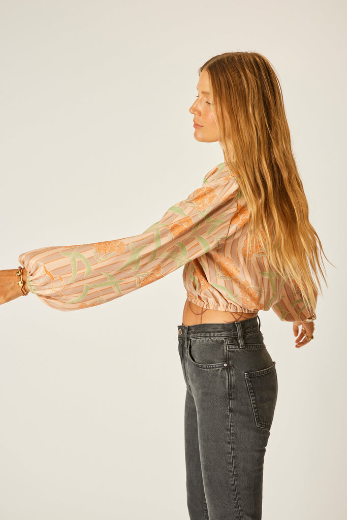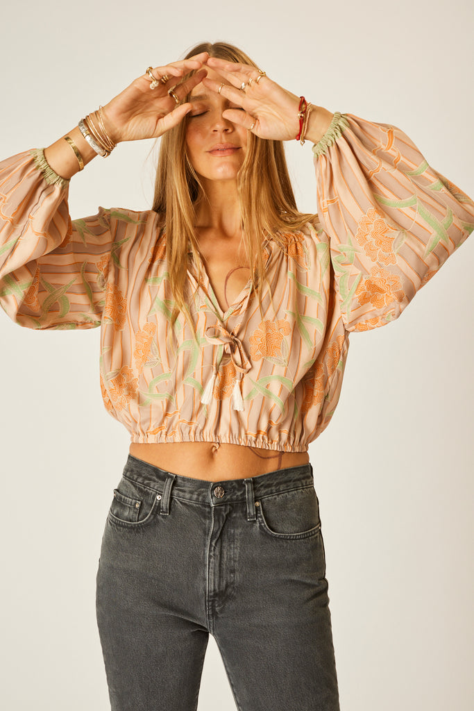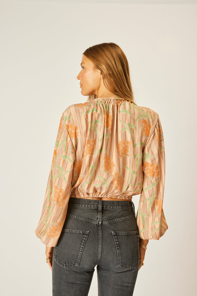 Cropped long-sleeve top with v-neckline and tie closure.