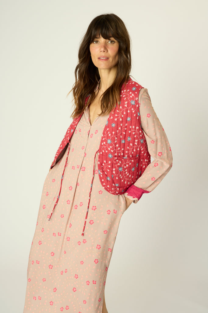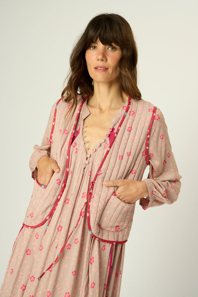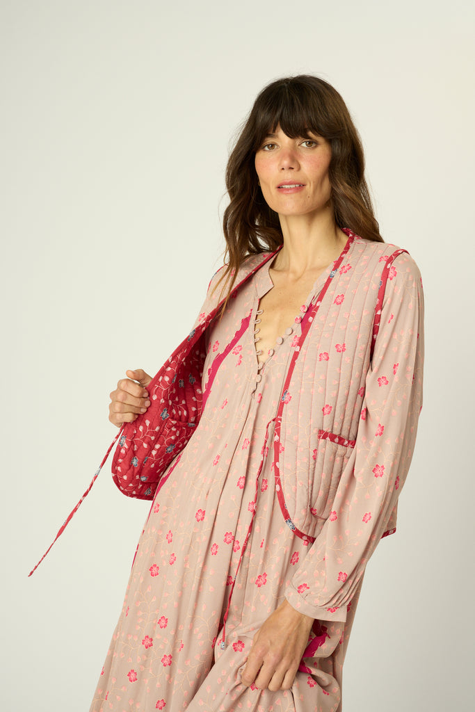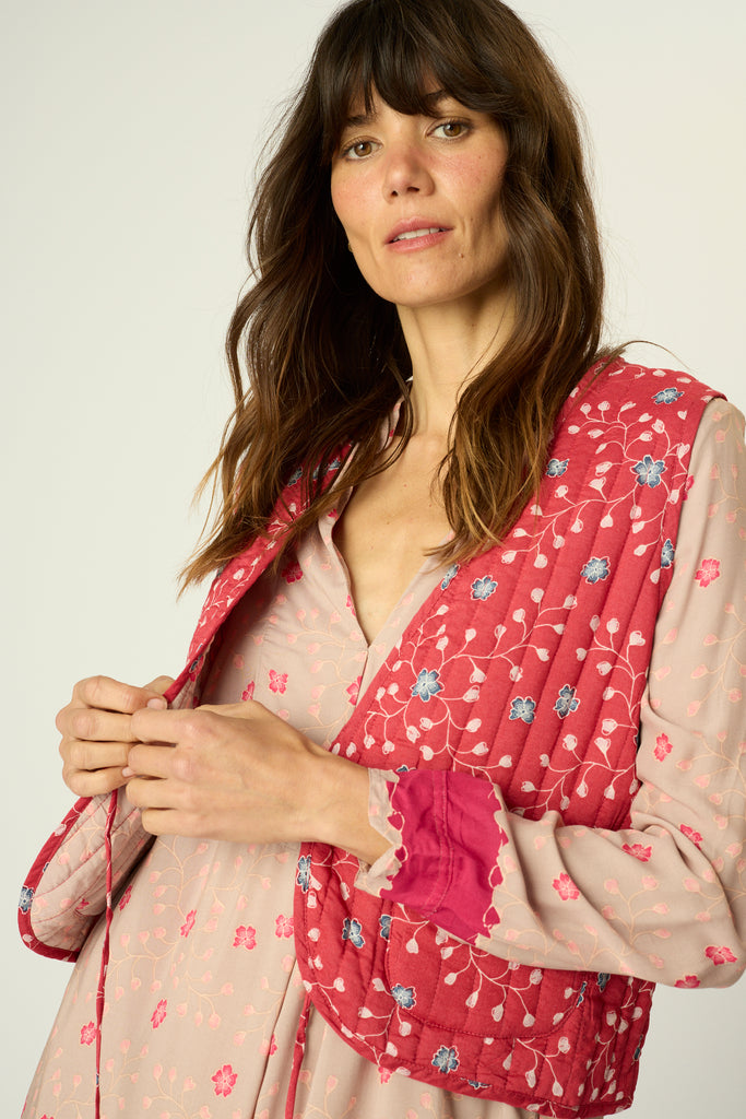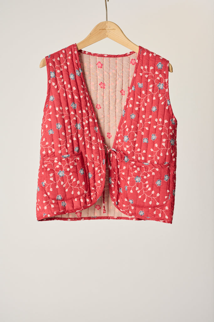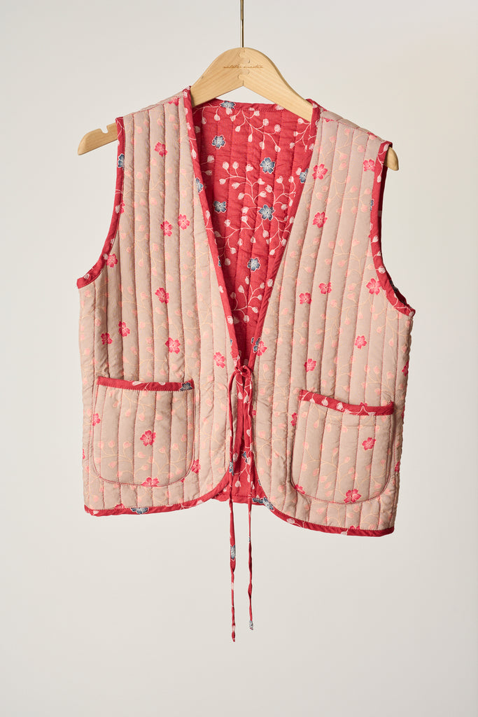 Fully reversible quilted vest with tie detailing at the front.