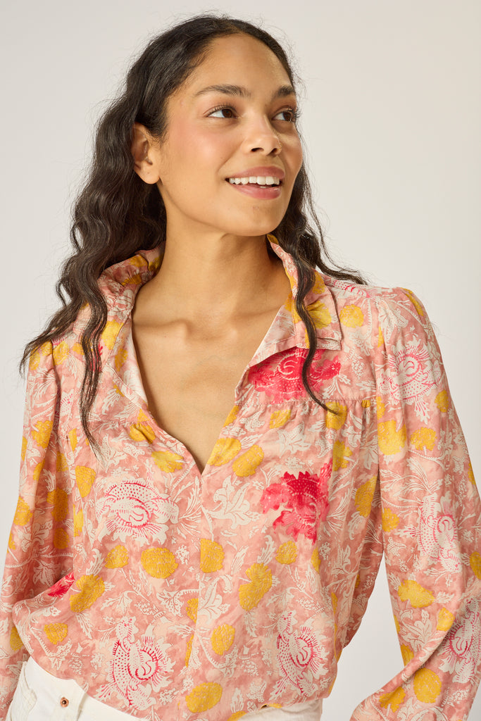 Flowy blouse with voluminous sleeves and button closure at wrist.