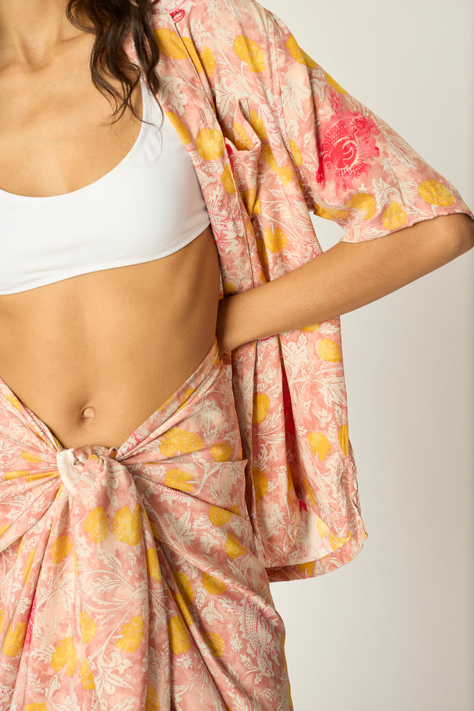 Features a pointed collar and pocket.