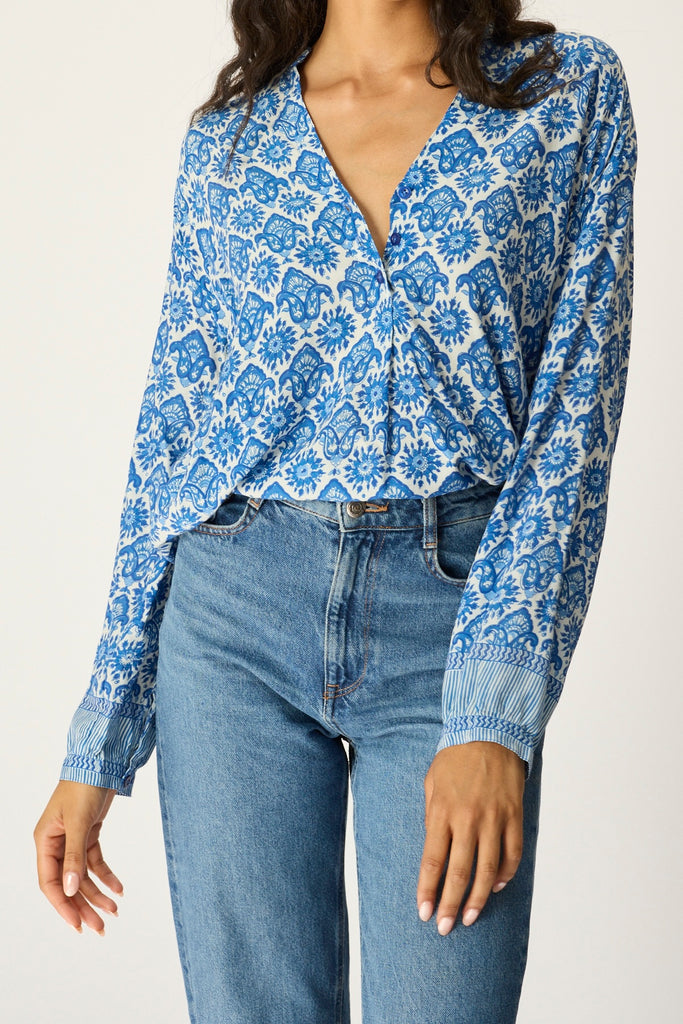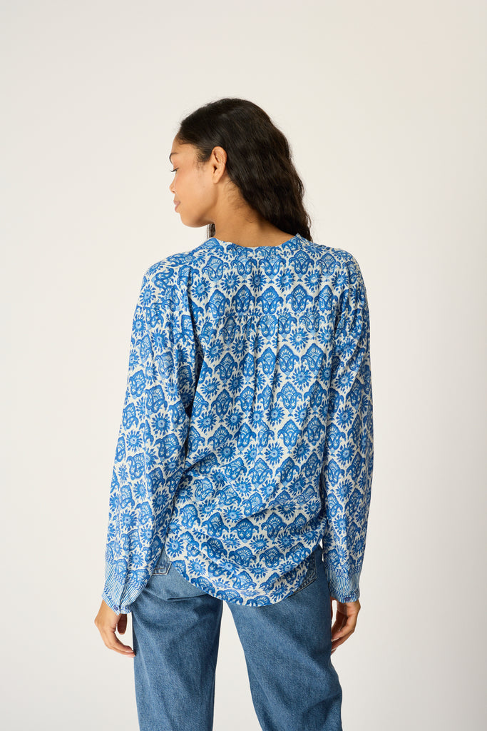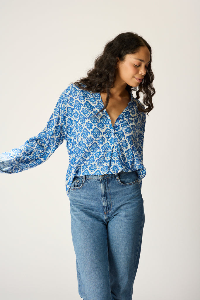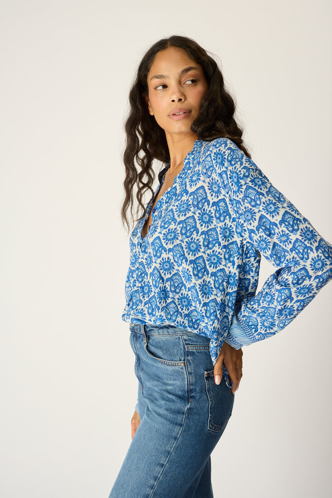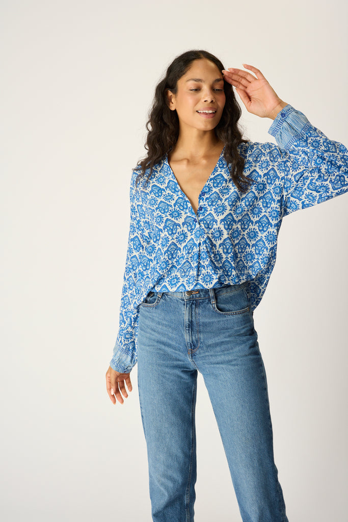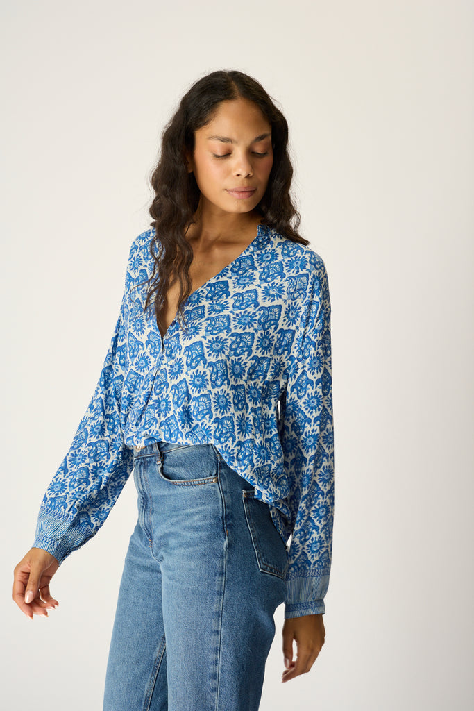 Tunic style blouse cut in a slim silhouette with button detailing at the cuffs.