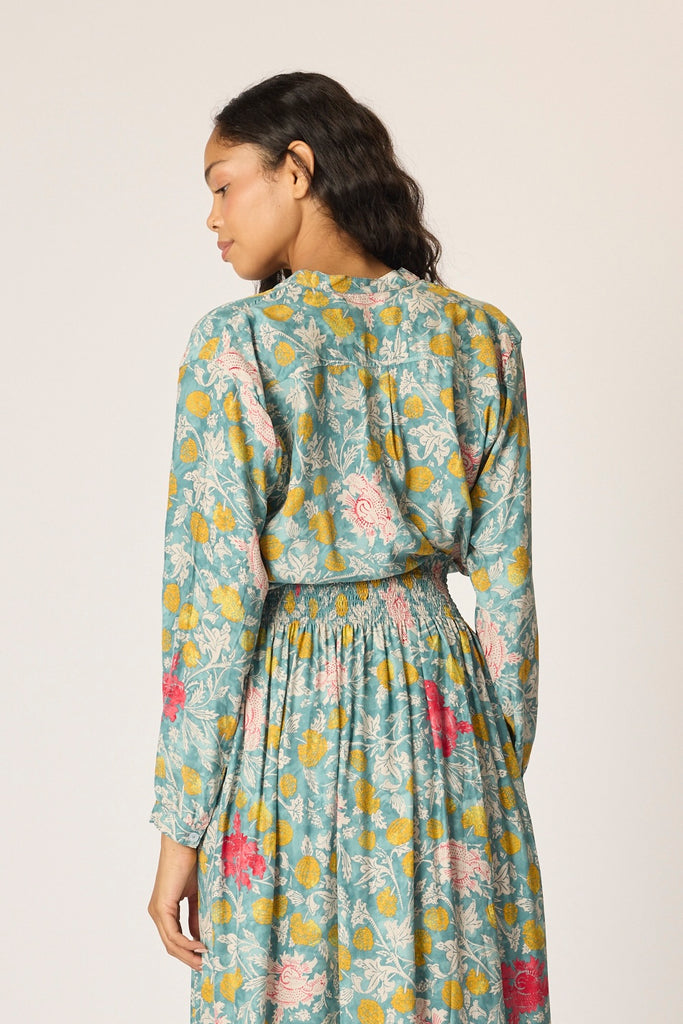 Tunic style blouse cut in a slim silhouette with button detailing at the cuffs.
