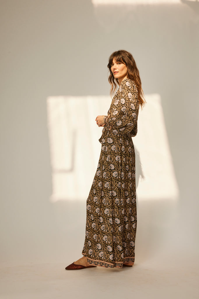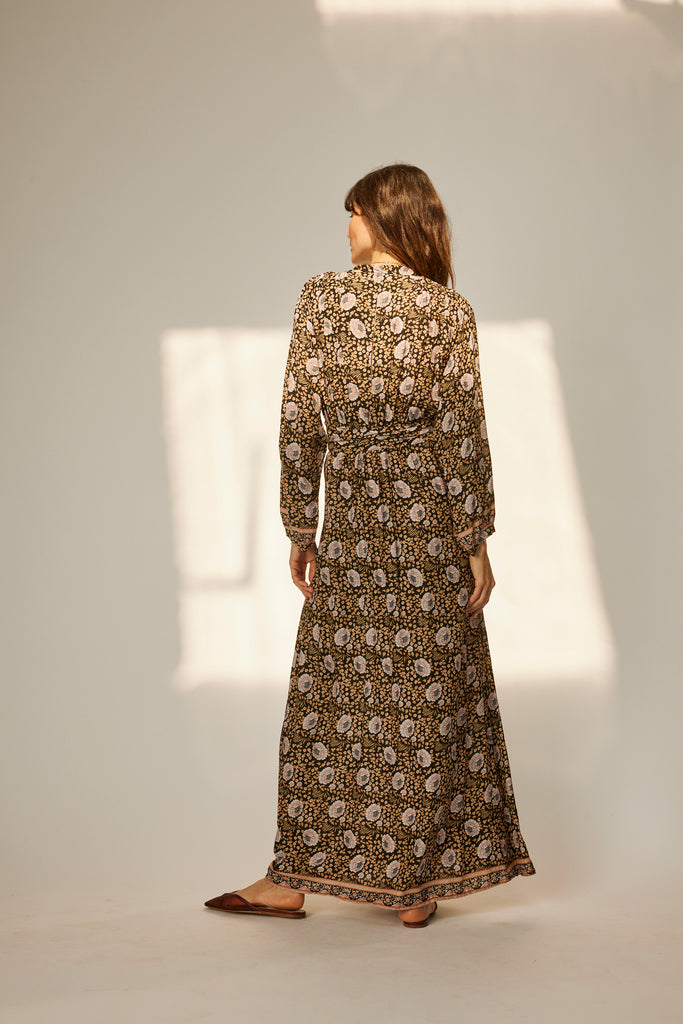 Long sleeve maxi dress with double snap closure across elastic waist.