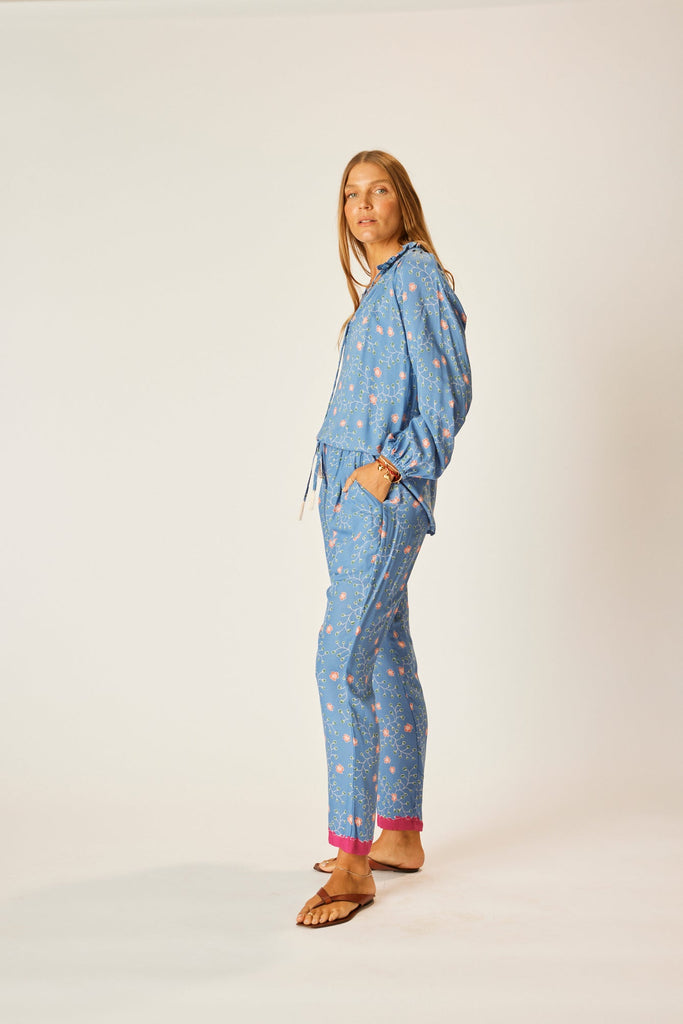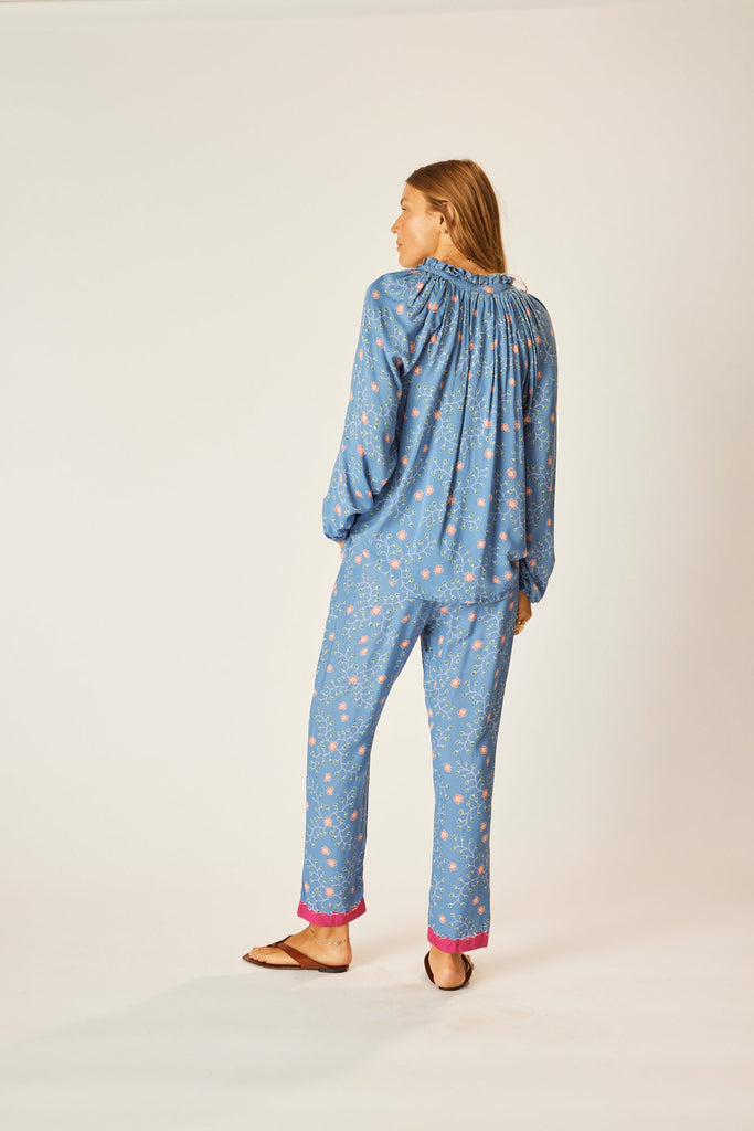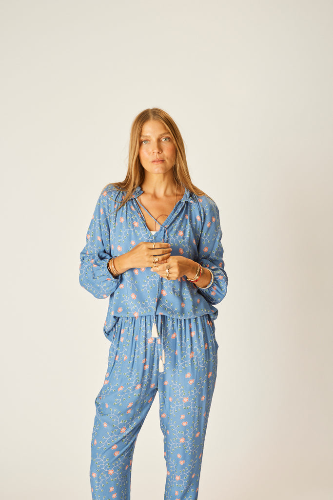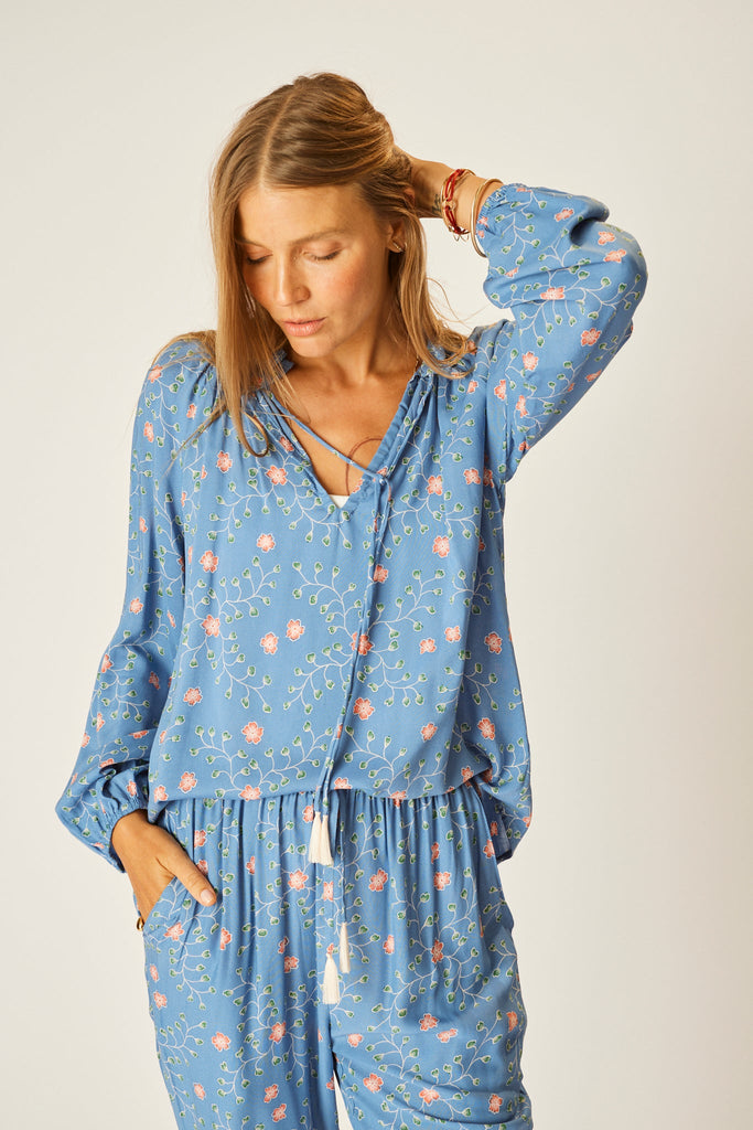 Flowy blouse with voluminous sleeves and button closure at wrist.