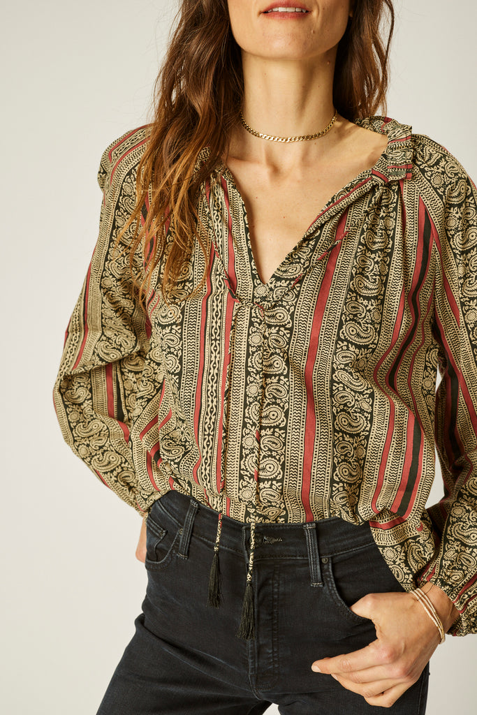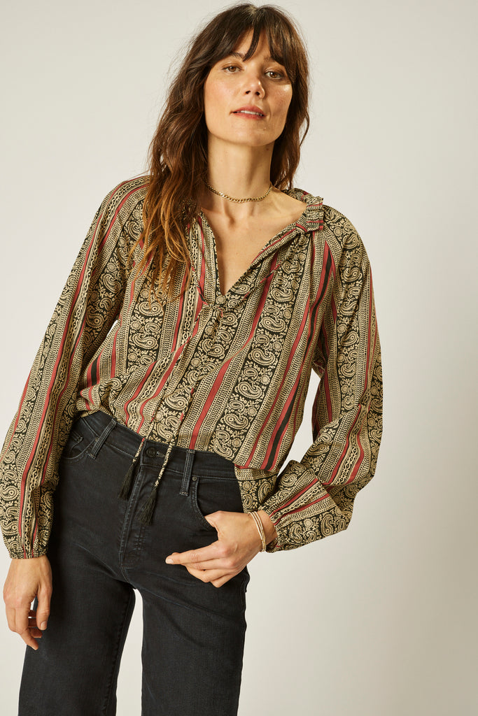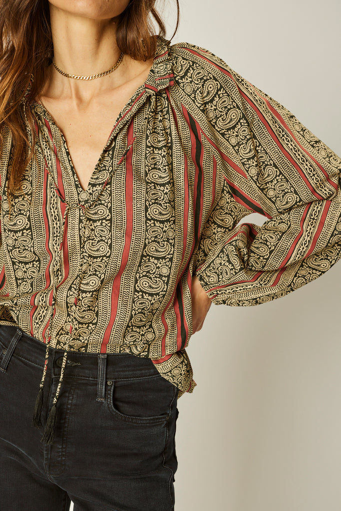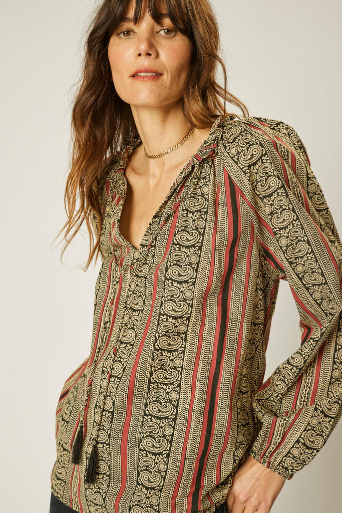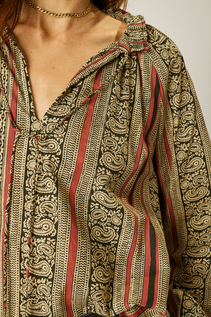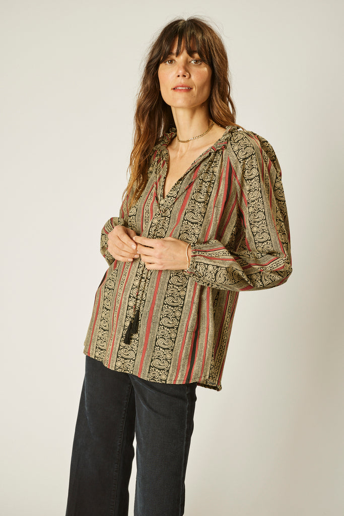 Flowy blouse with voluminous sleeves and button closure at wrist.