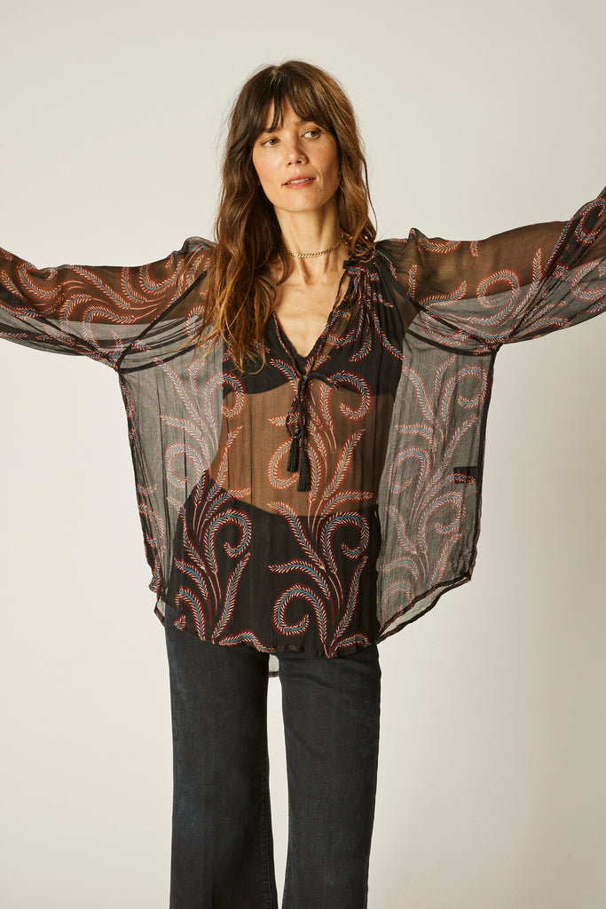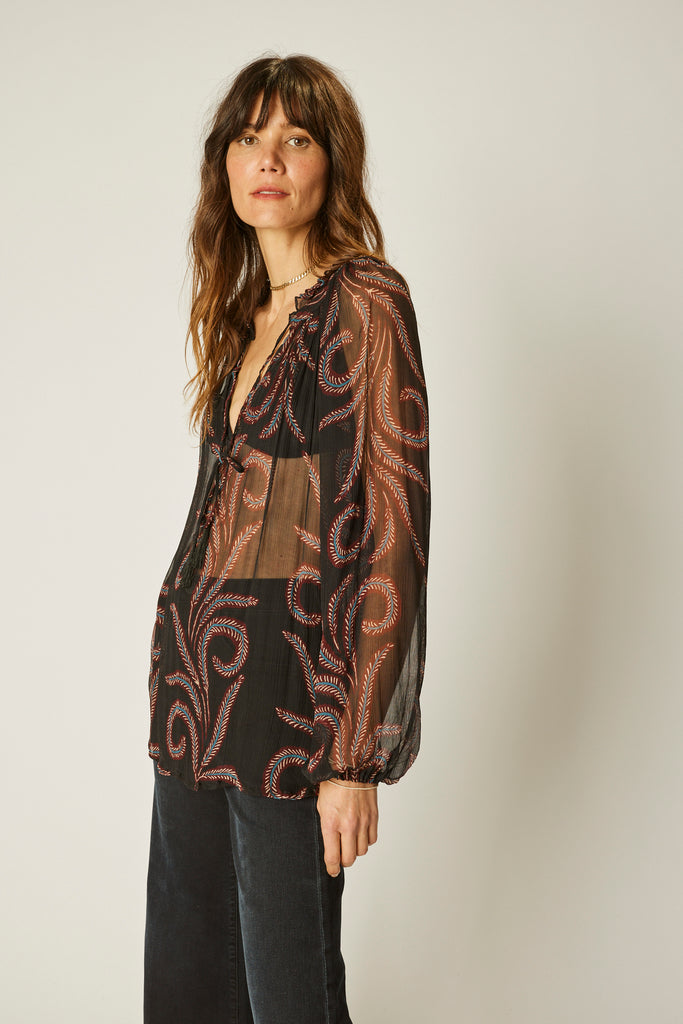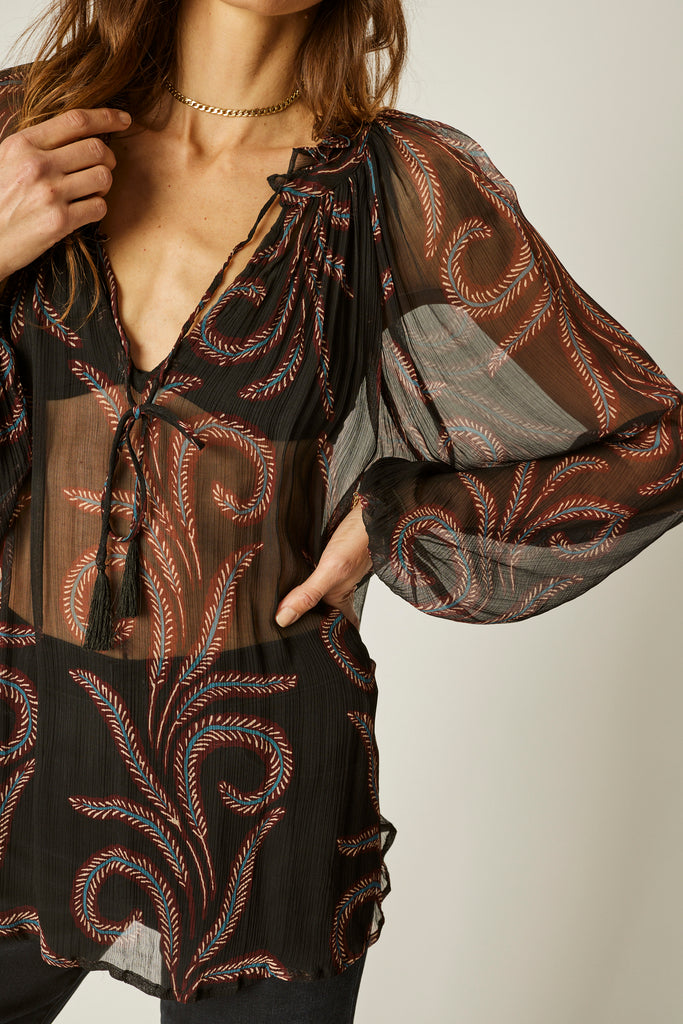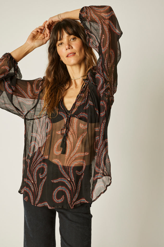 Flowy blouse with voluminous sleeves and button closure at wrist.