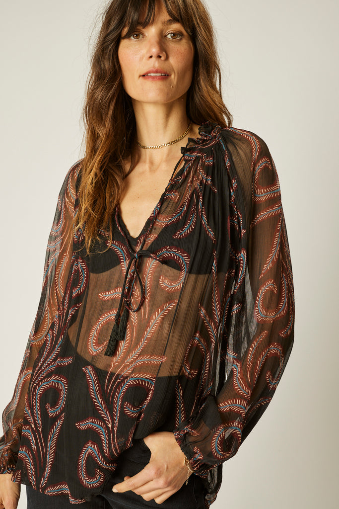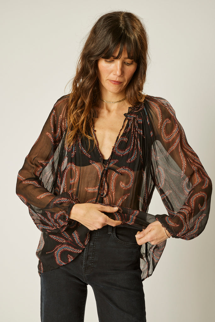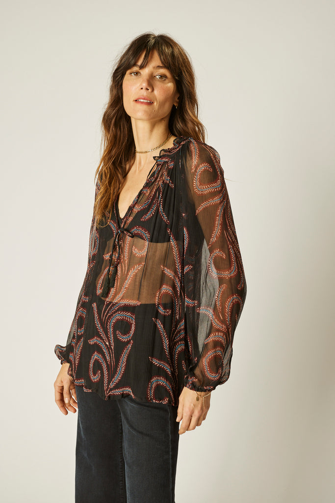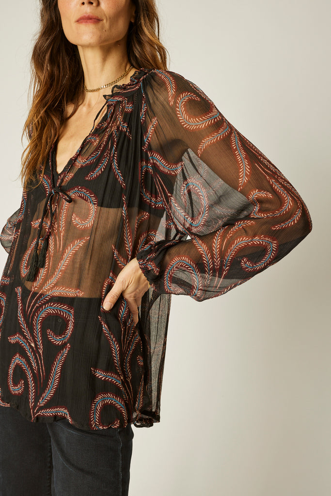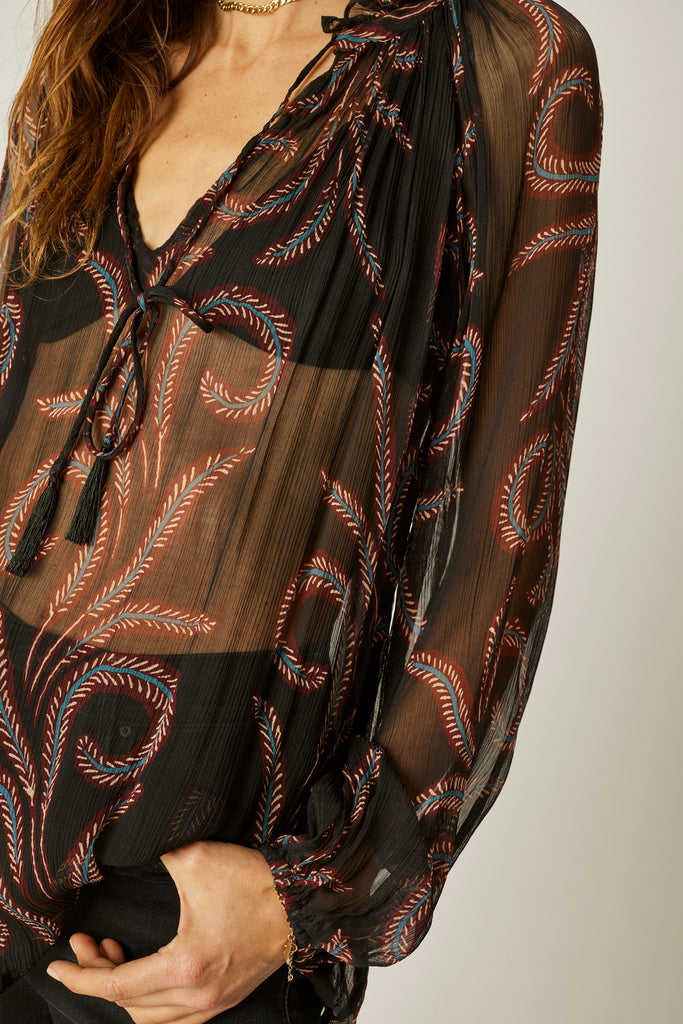 Flowy blouse with voluminous sleeves and button closure at wrist.