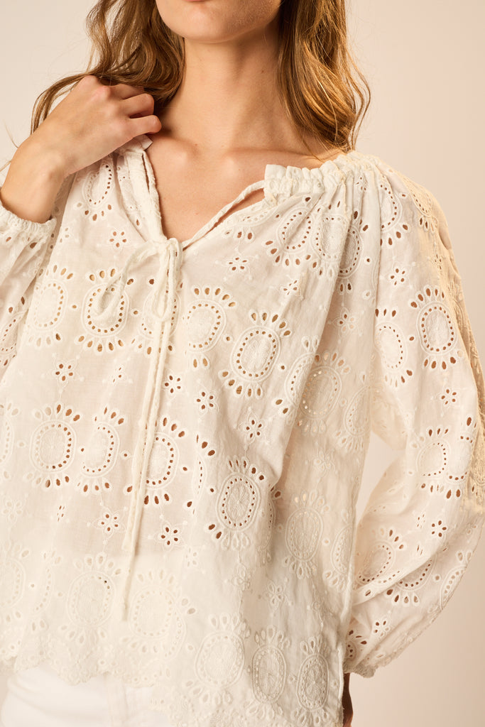 Cut in a fluid, oversized silhouette with feminine tie-detailing at the neck and elasticized sleeves making Ashley an easy to pair wardrobing staple.
