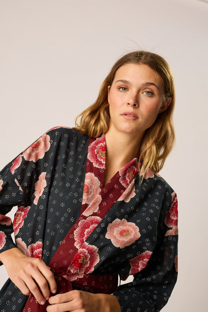 Japanese inspired robe with a drop shoulder and full sleeves.