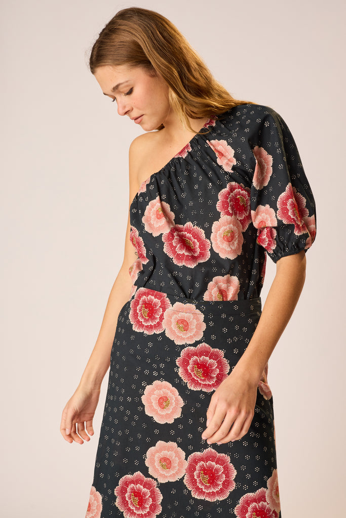 Our Erin top is a one shoulder style with an elastic neck detailing.