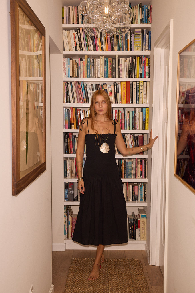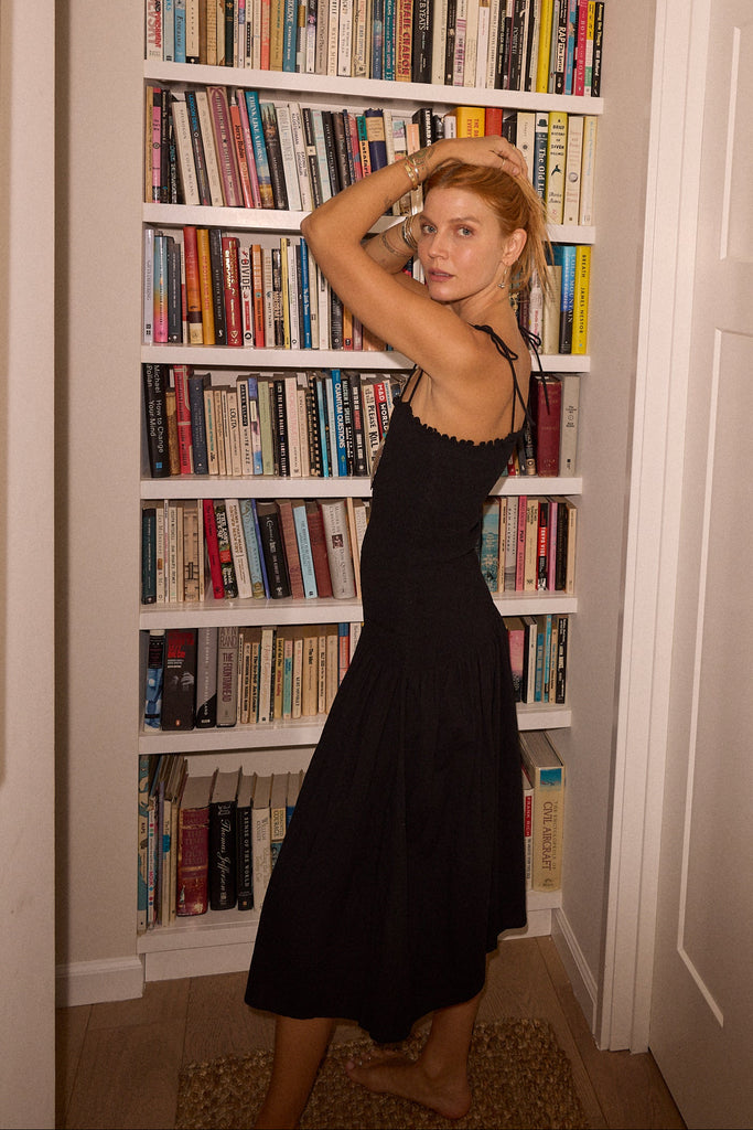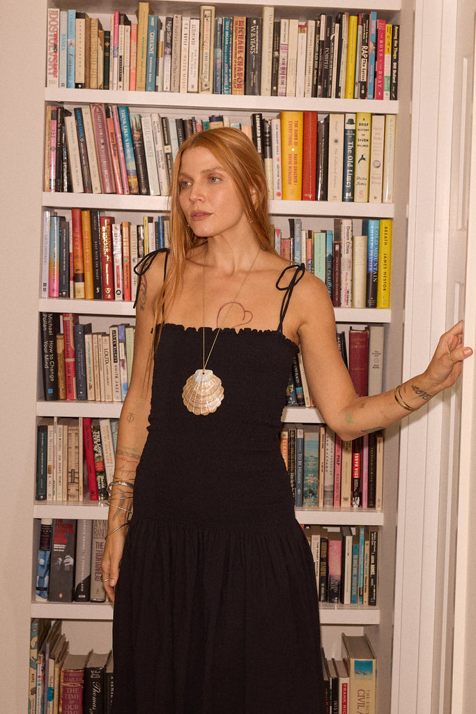 Maxi dress with an smocked bodice down to the hips, flounce hem, and tie-adjustable straps.