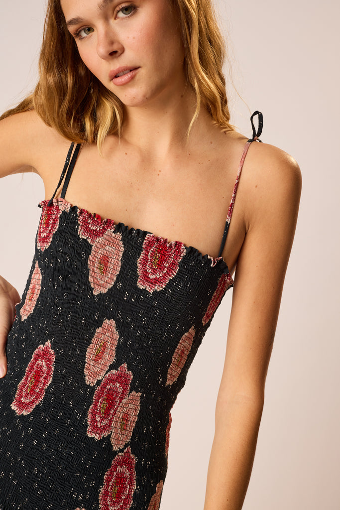 Maxi dress with an smocked bodice down to the hips, flounce hem, and tie-adjustable straps.