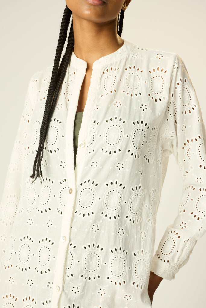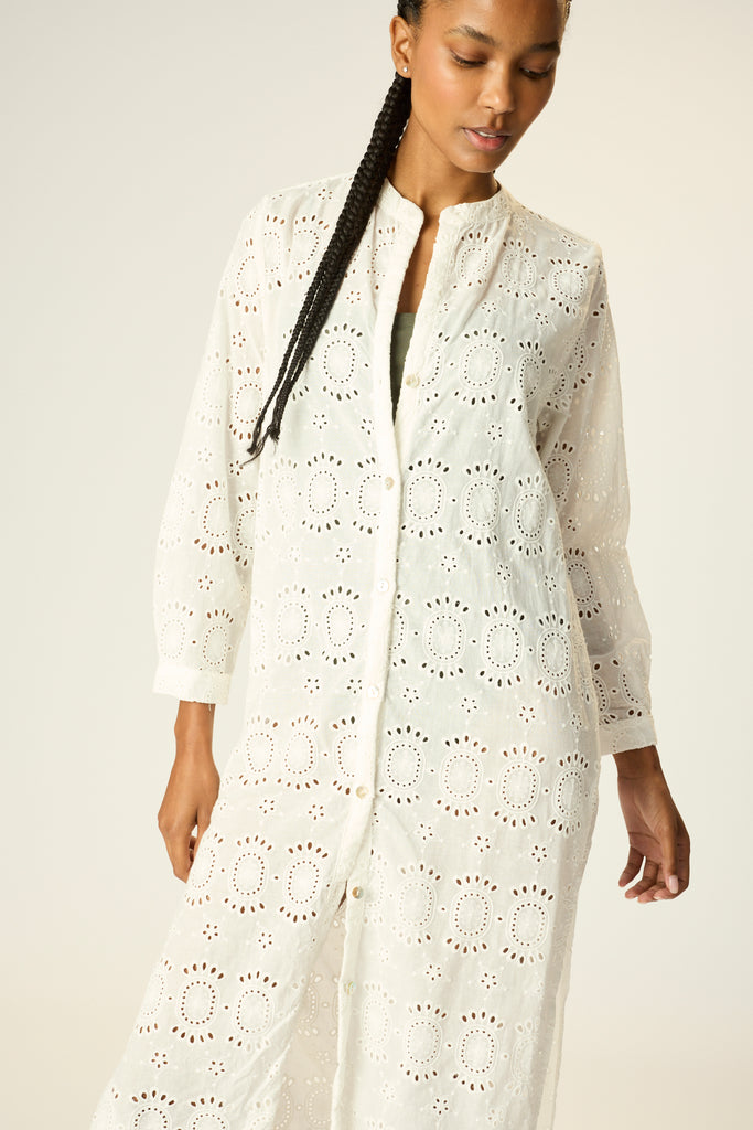 Collarless neckline with long sleeves.
