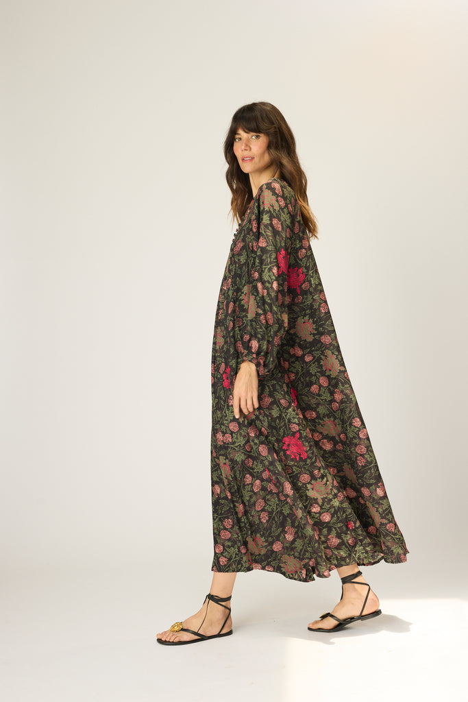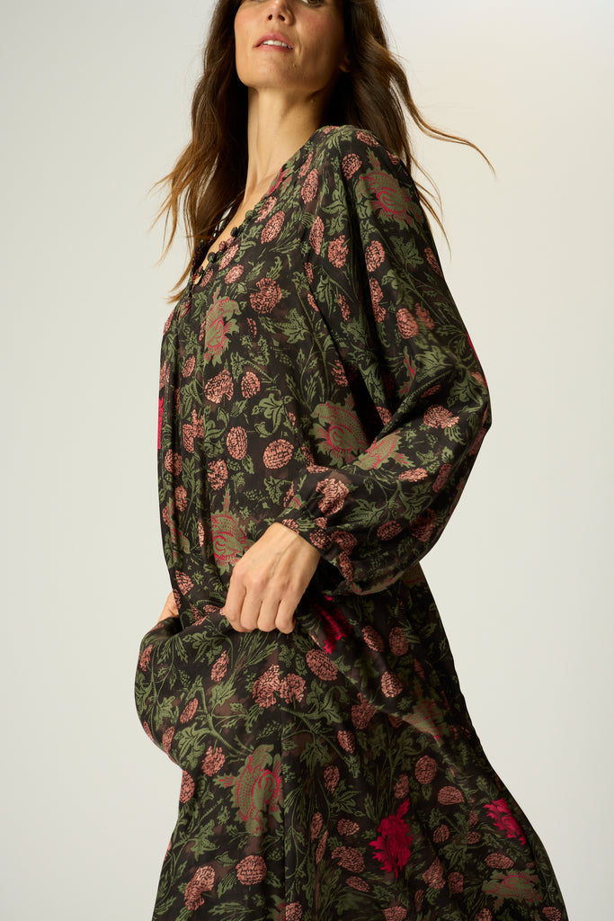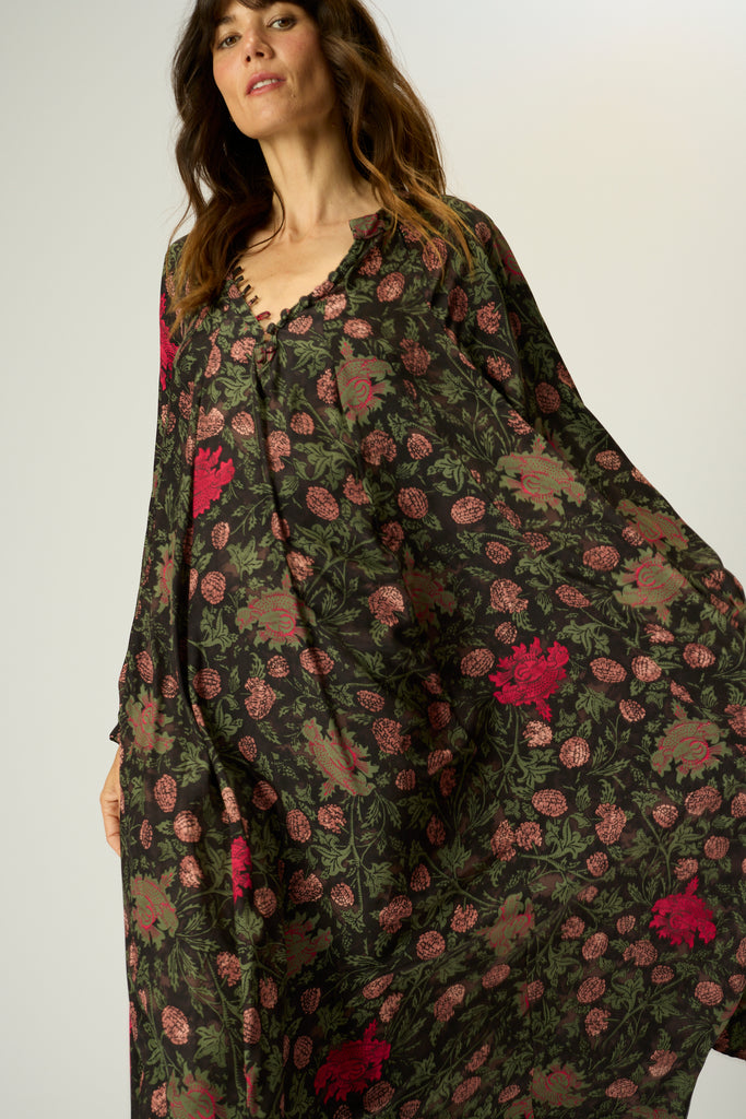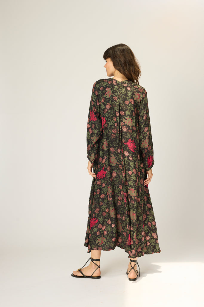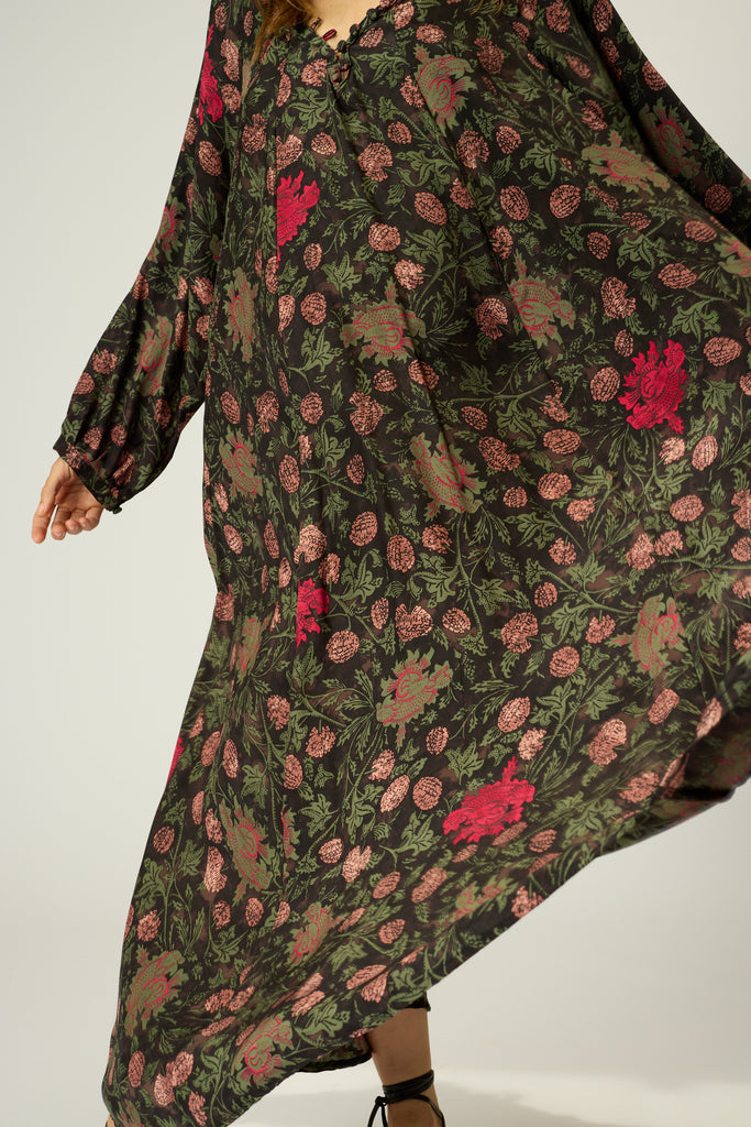 A-line cut and voluminous long sleeves.