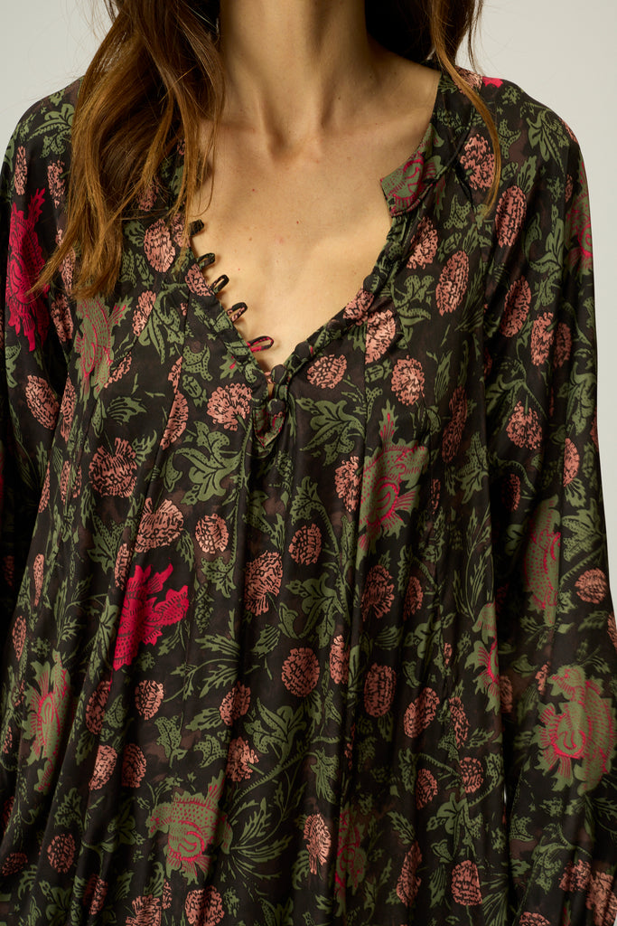 Deep v-neckline with covered buttons.