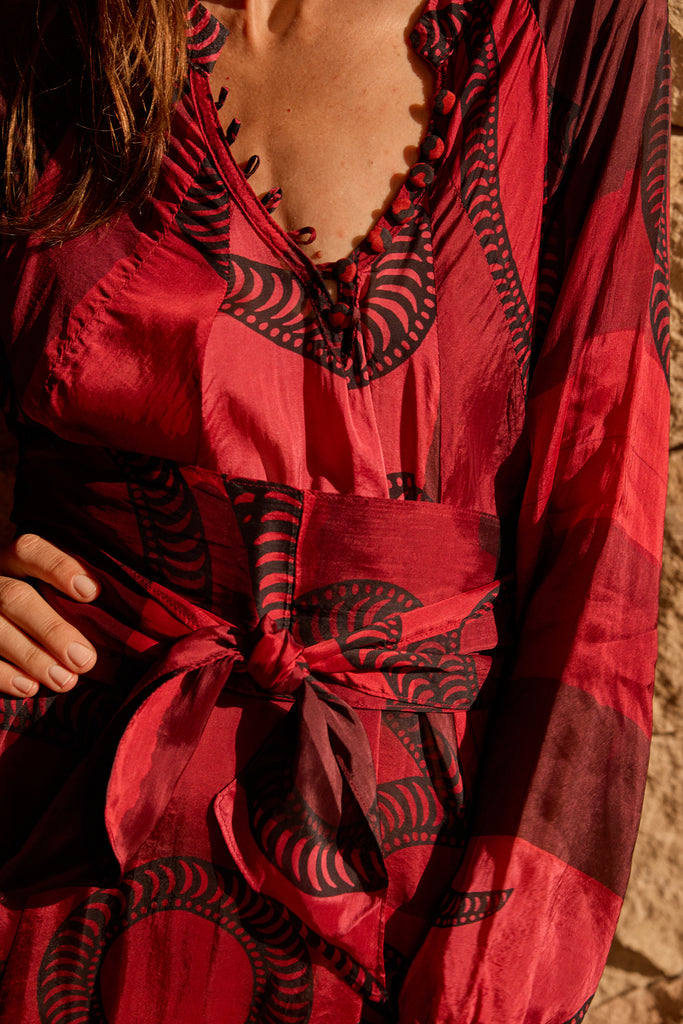 Deep v-neckline with covered buttons.
