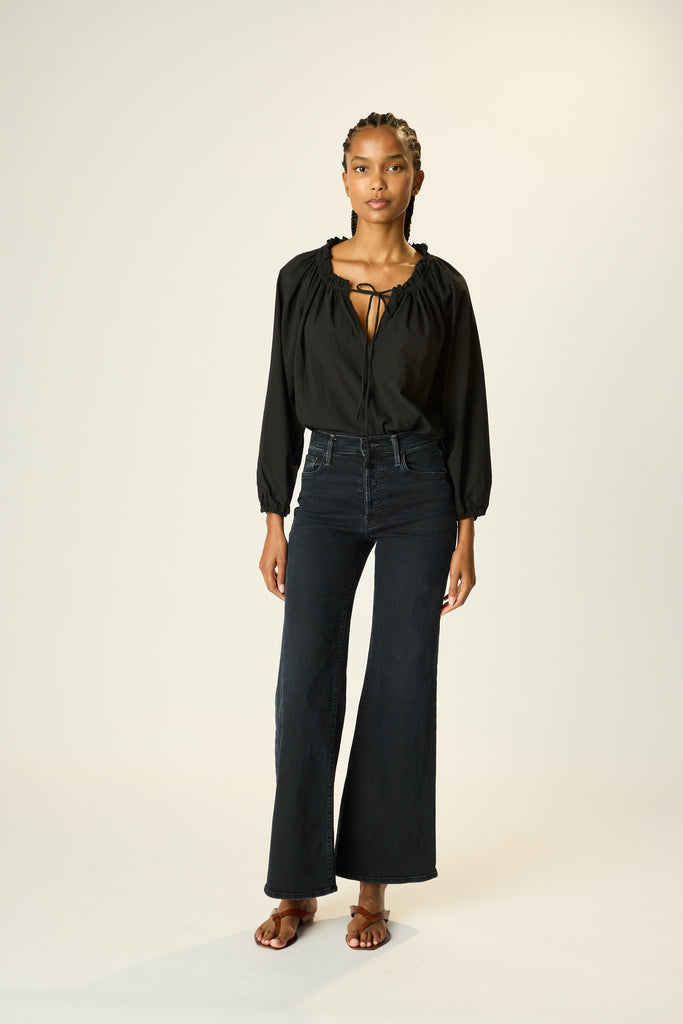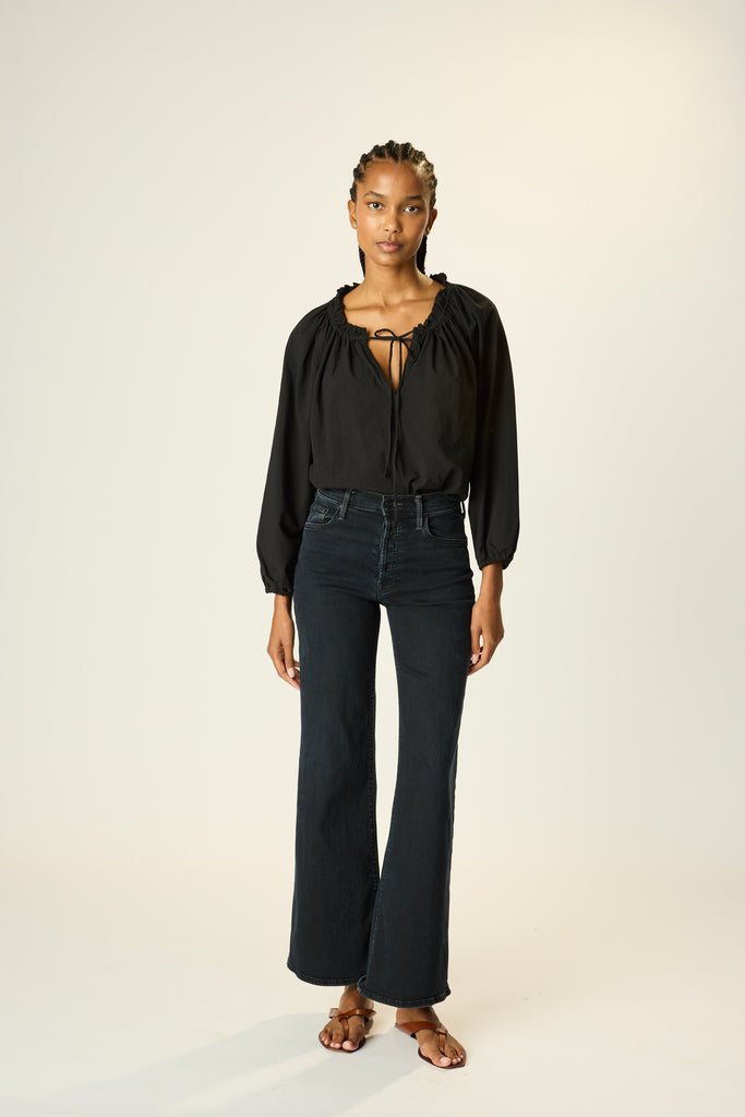 Cut in a fluid, oversized silhouette with feminine tie-detailing at the neck and elasticized sleeves making Ashley an easy to pair wardrobing staple.