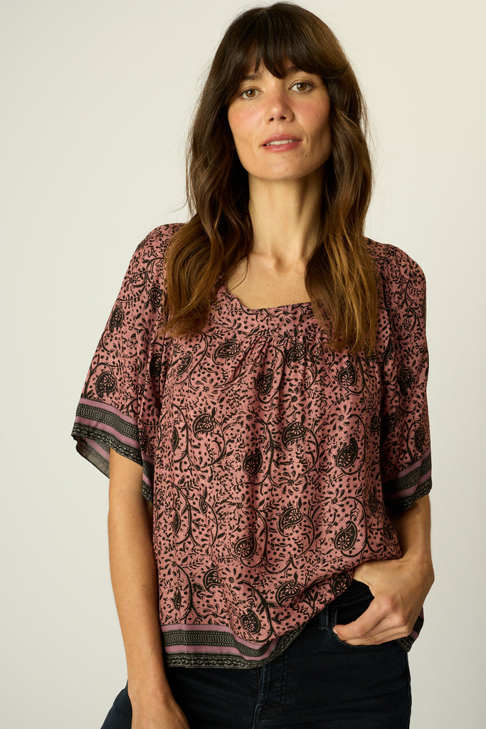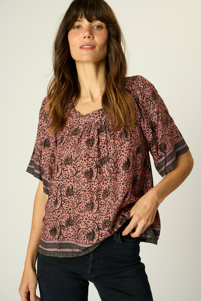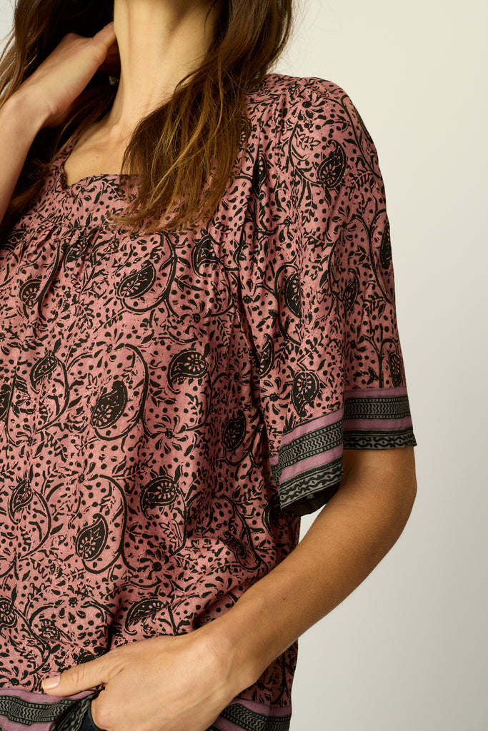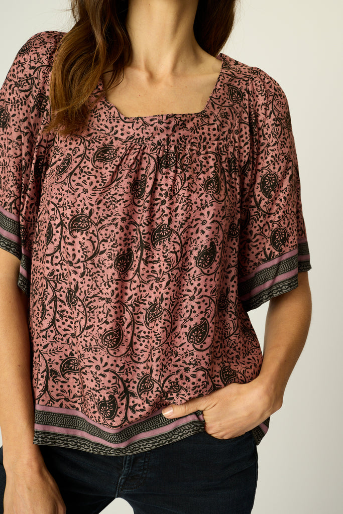Short sleeve top with thick square neck.