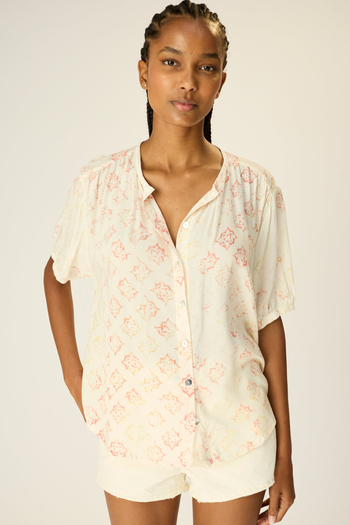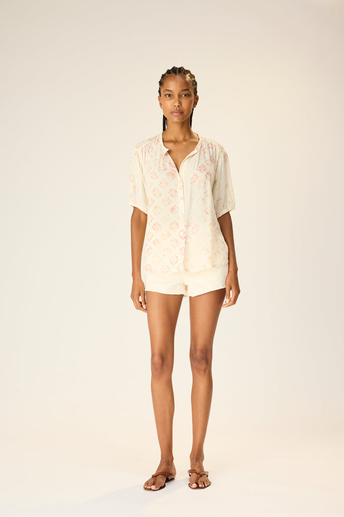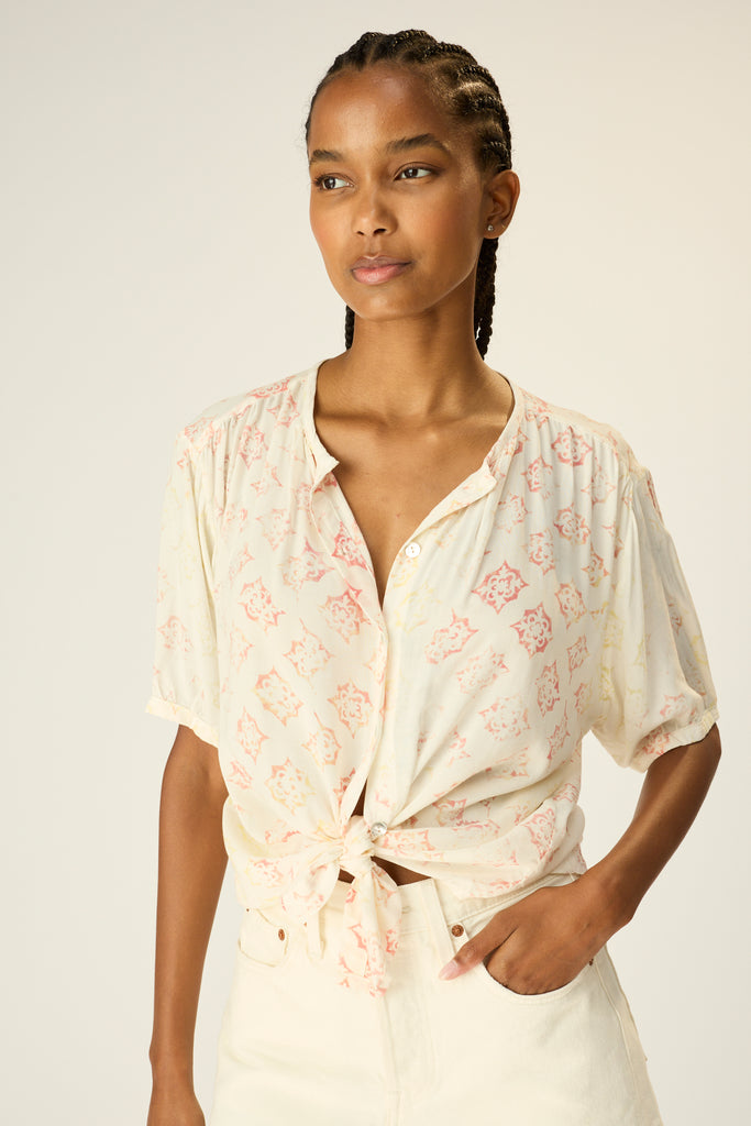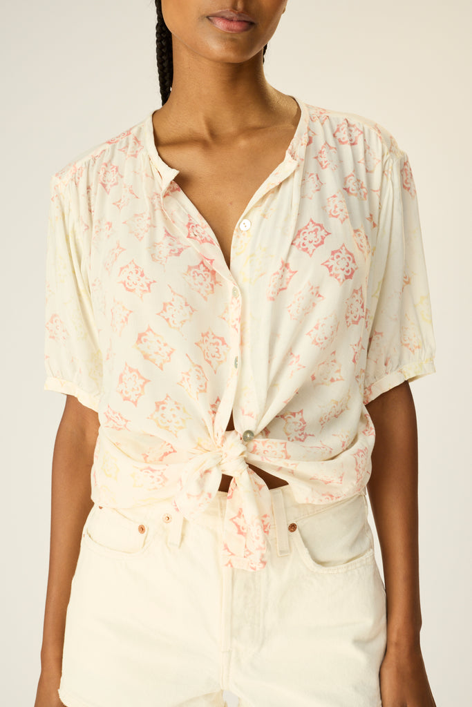 V-neck blouse with shell buttons.