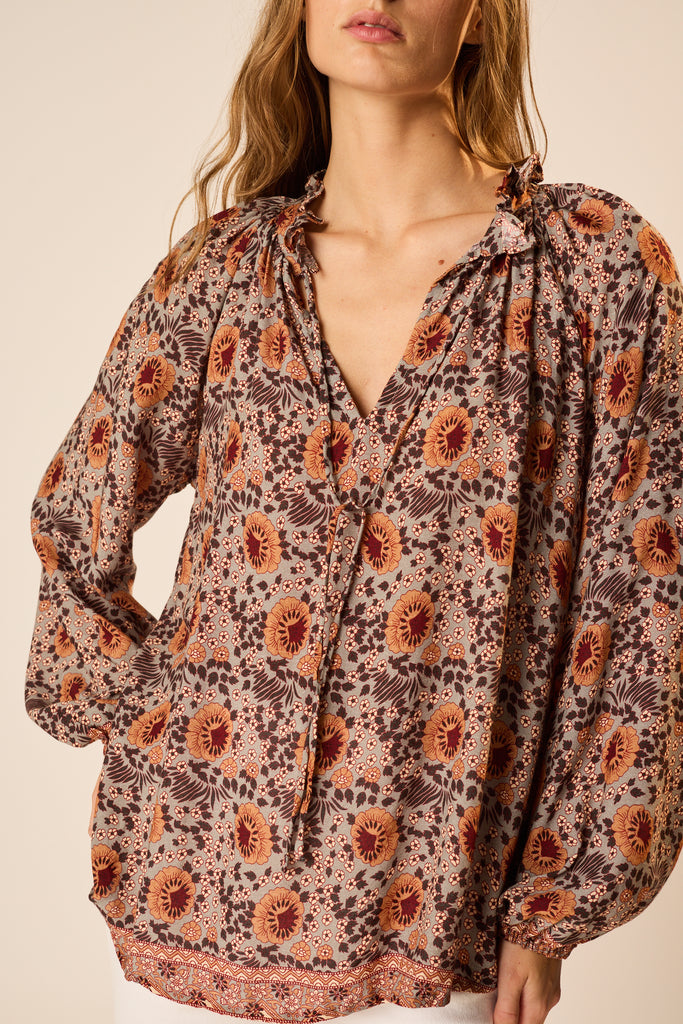 Flowy blouse with voluminous sleeves and button closure at wrist.
